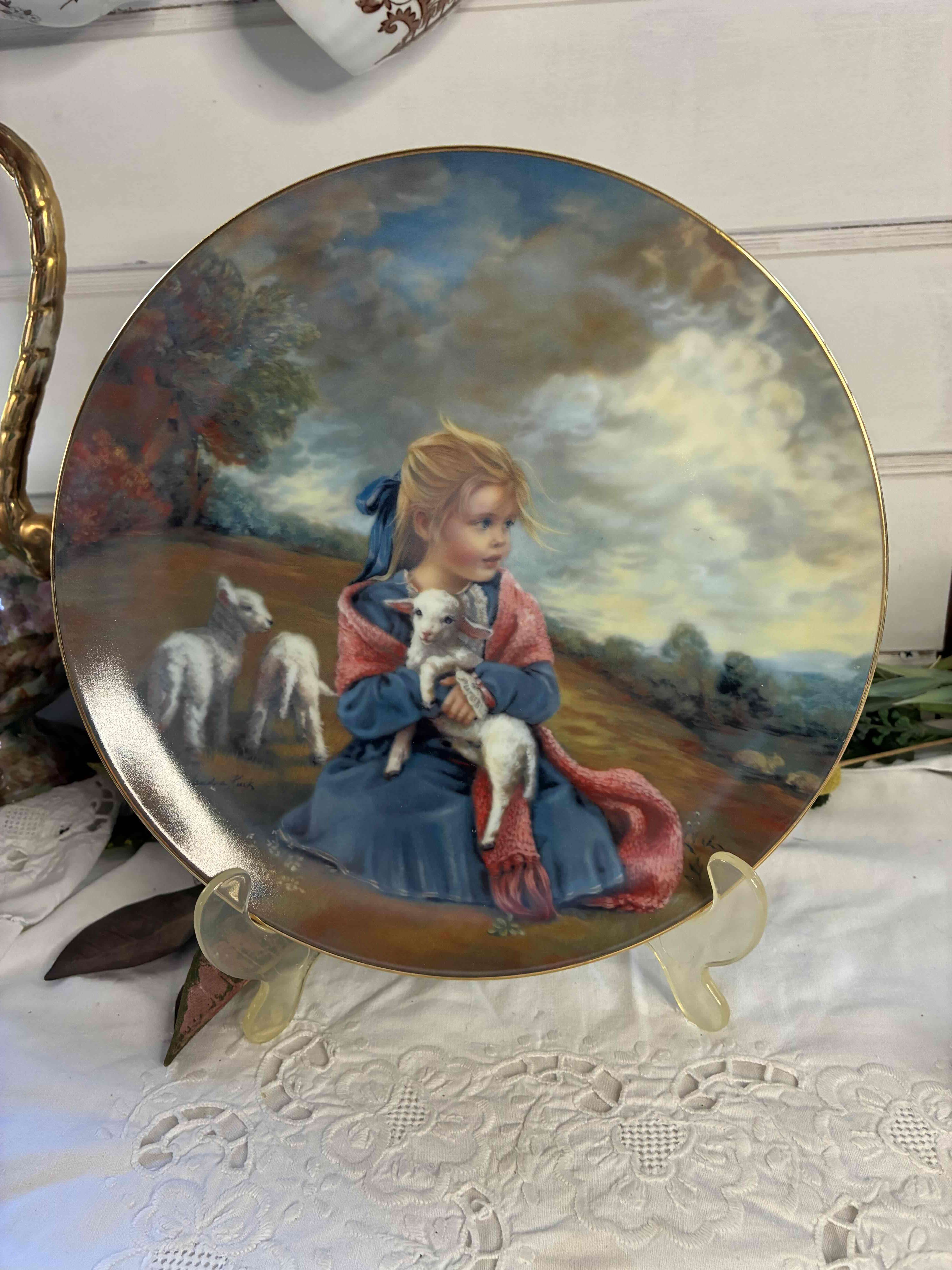 Hermoso plato decorativo con imagen de niña y cordero. Ideal para coleccionistas y amantes de la decoración clásica. Origen Estados Unidos