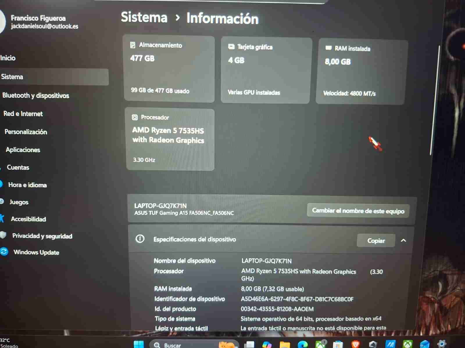 Potente laptop Asus para juegos con procesador Ryzen 5 y gráficos Radeon. En buen estado general, ideal para gaming.