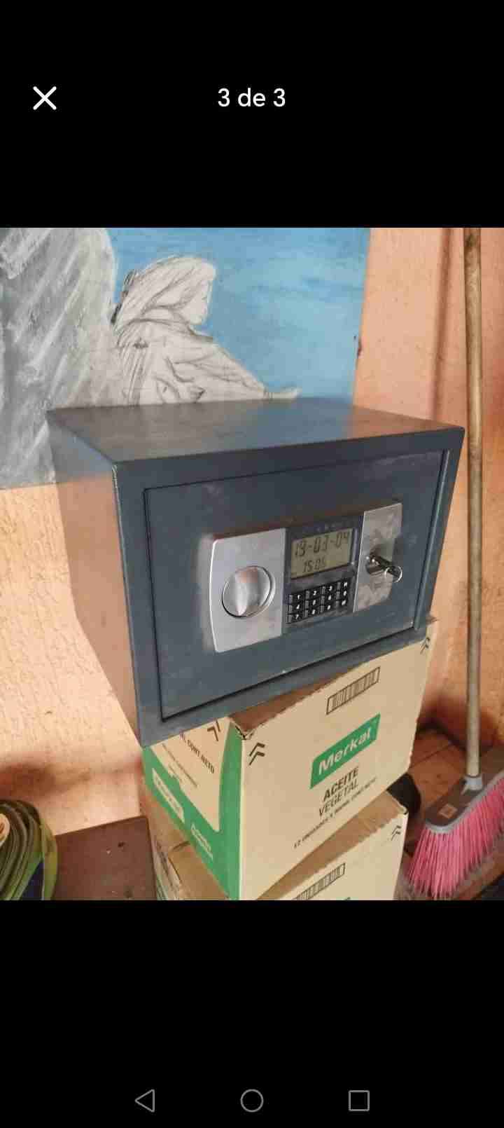 Caja fuerte compacta de combinación electrónica, ideal para hogar u oficina. Buen estado general, con leves signos de uso.