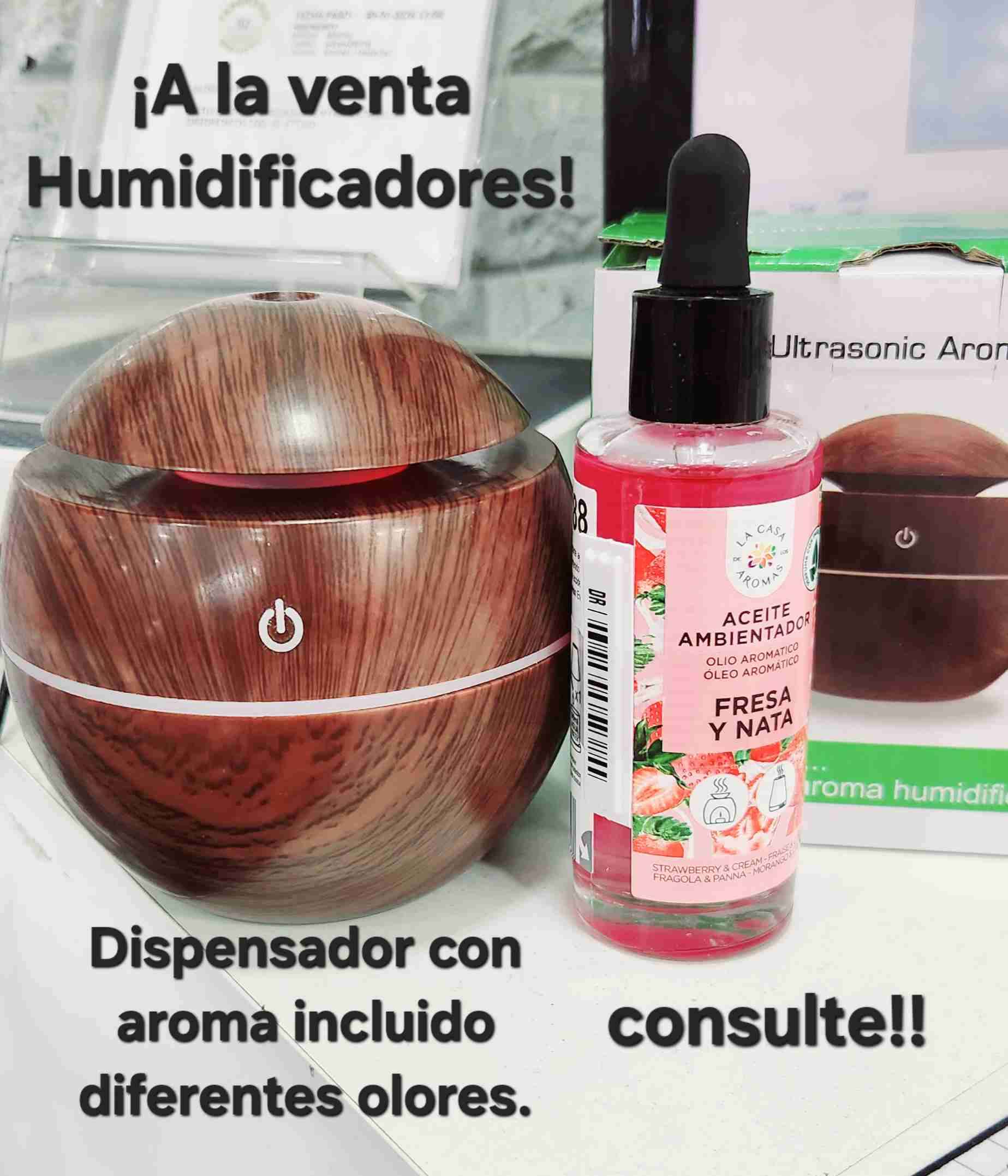 Humidificador ultrasónico con diseño de madera y dispensador de aroma incluido. Ideal para ambientes frescos y aromáticos.