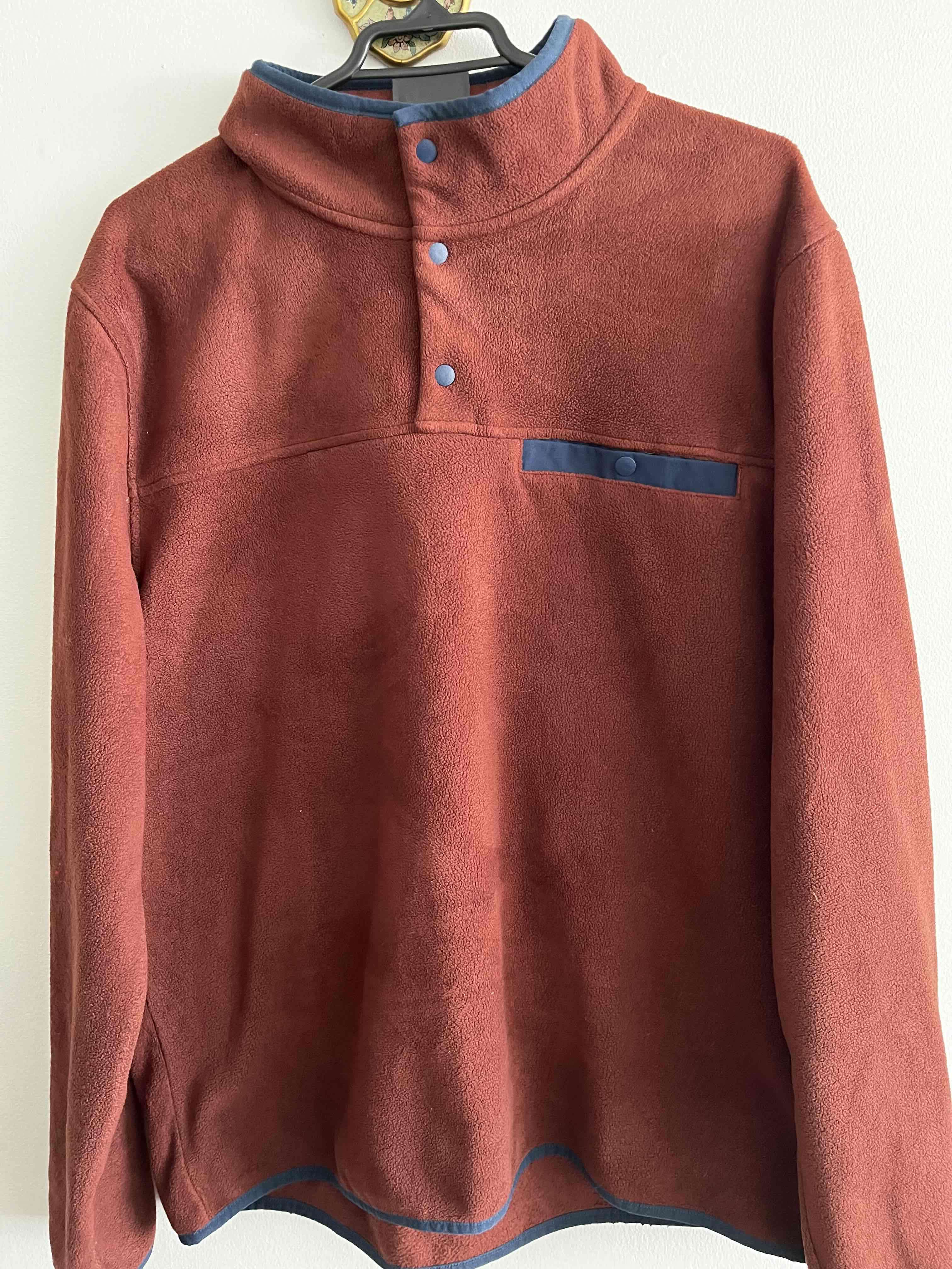 Poleron polar rojo ladrillo con detalles azules, estilo casual y abrigadora. En buen estado general, ideal para el invierno.