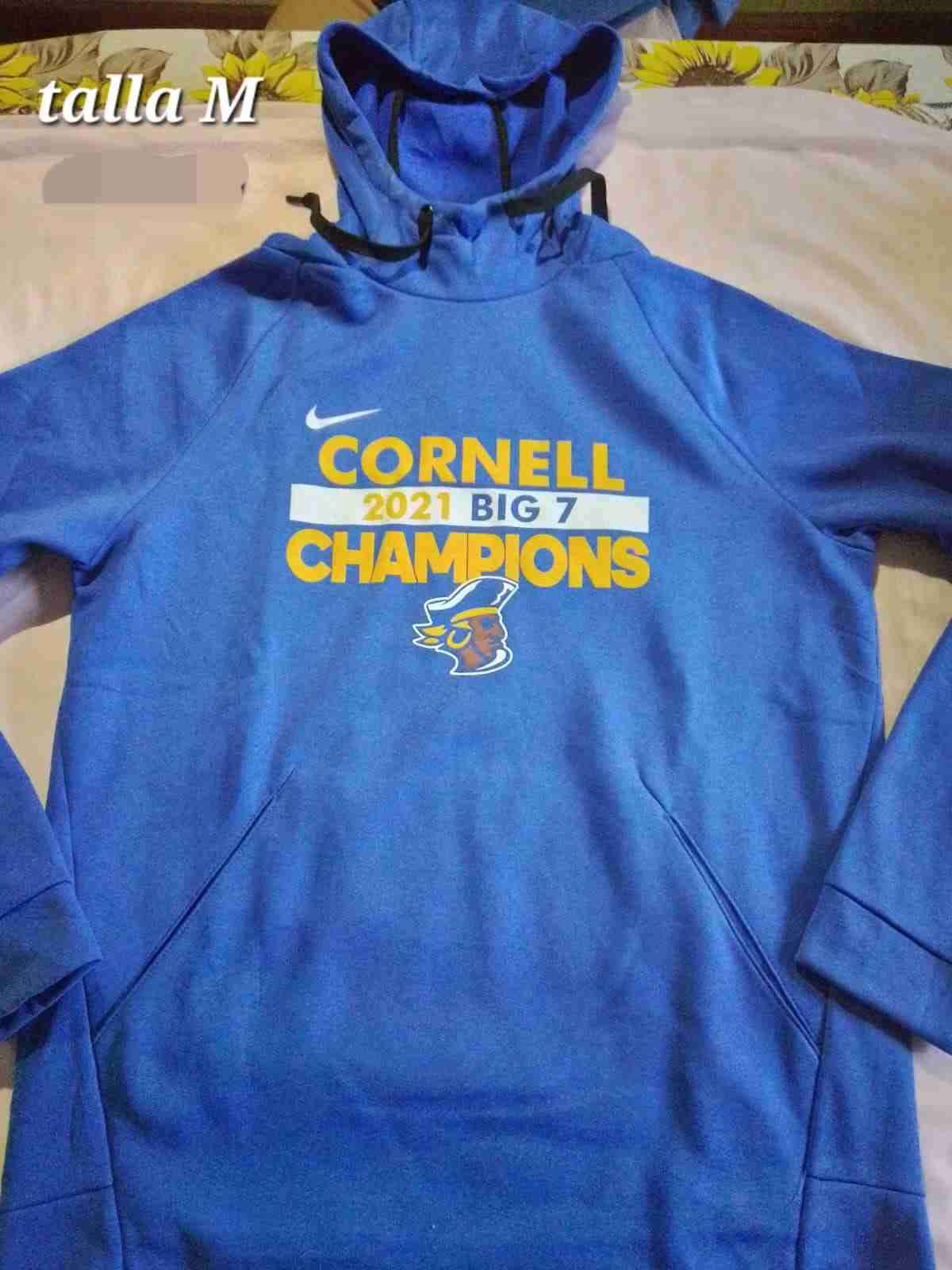 Polerón azul con capucha y diseño Cornell Champions 2021. Ideal para días frescos, en buen estado.