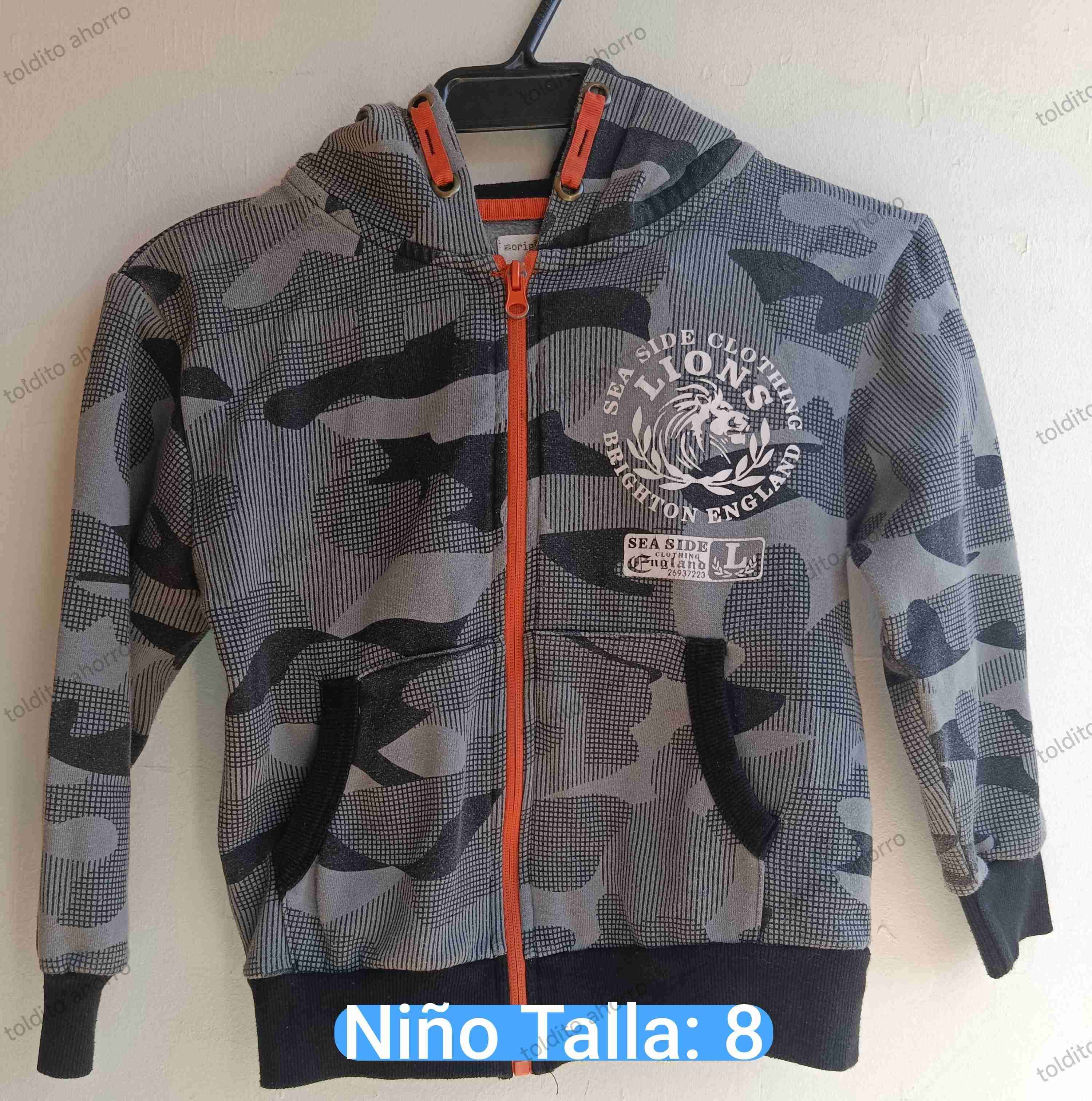 Polerón con diseño de camuflaje,talla 8, con cierre y capucha, ideal para climas frescos. Estado general bueno.