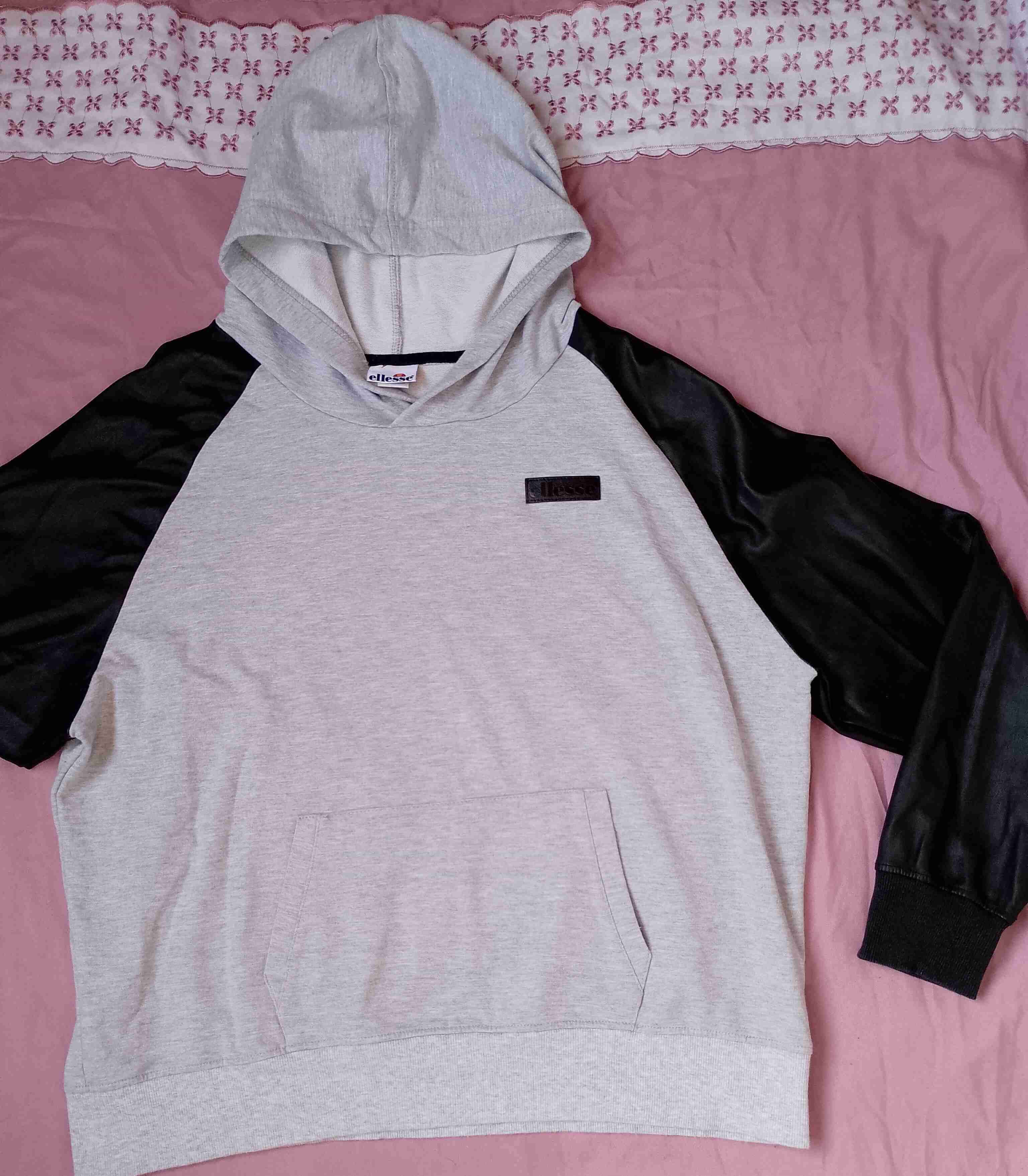 Polerón gris casual con mangas eco cuero y bolsillo delantero. Ideal para el otoño. Marca Ellesse talla M , excelente estado.