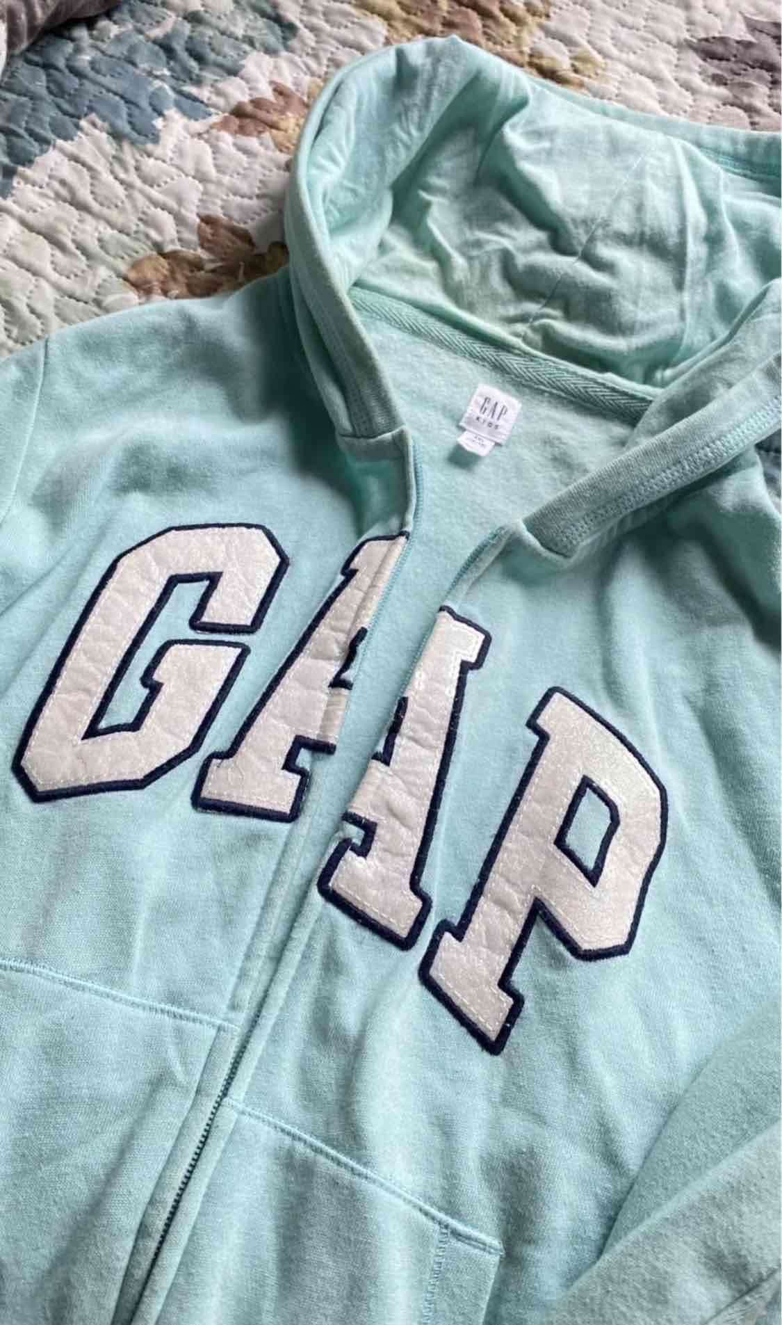 Polerón GAP verde menta con capucha, ideal para días frescos. En buen estado, cómodo y casual.