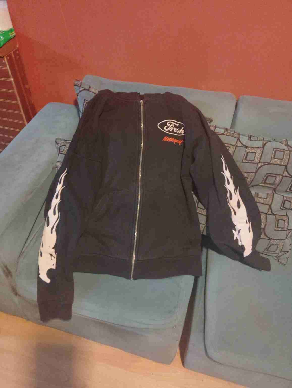 Polerón negro con cierre y estampado de llamas en las mangas. En buen estado, ideal para un look casual. Exclusivo Precio negociable