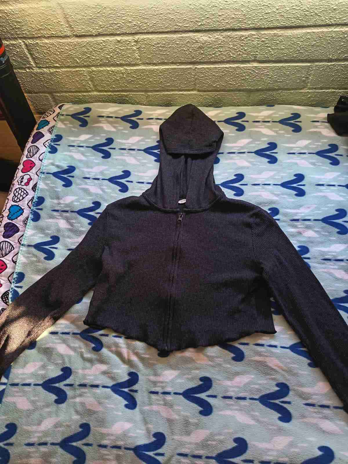 Polerón corto de color plomo, estilo casual con capucha. Perfecto para uso diario, en buen estado general.