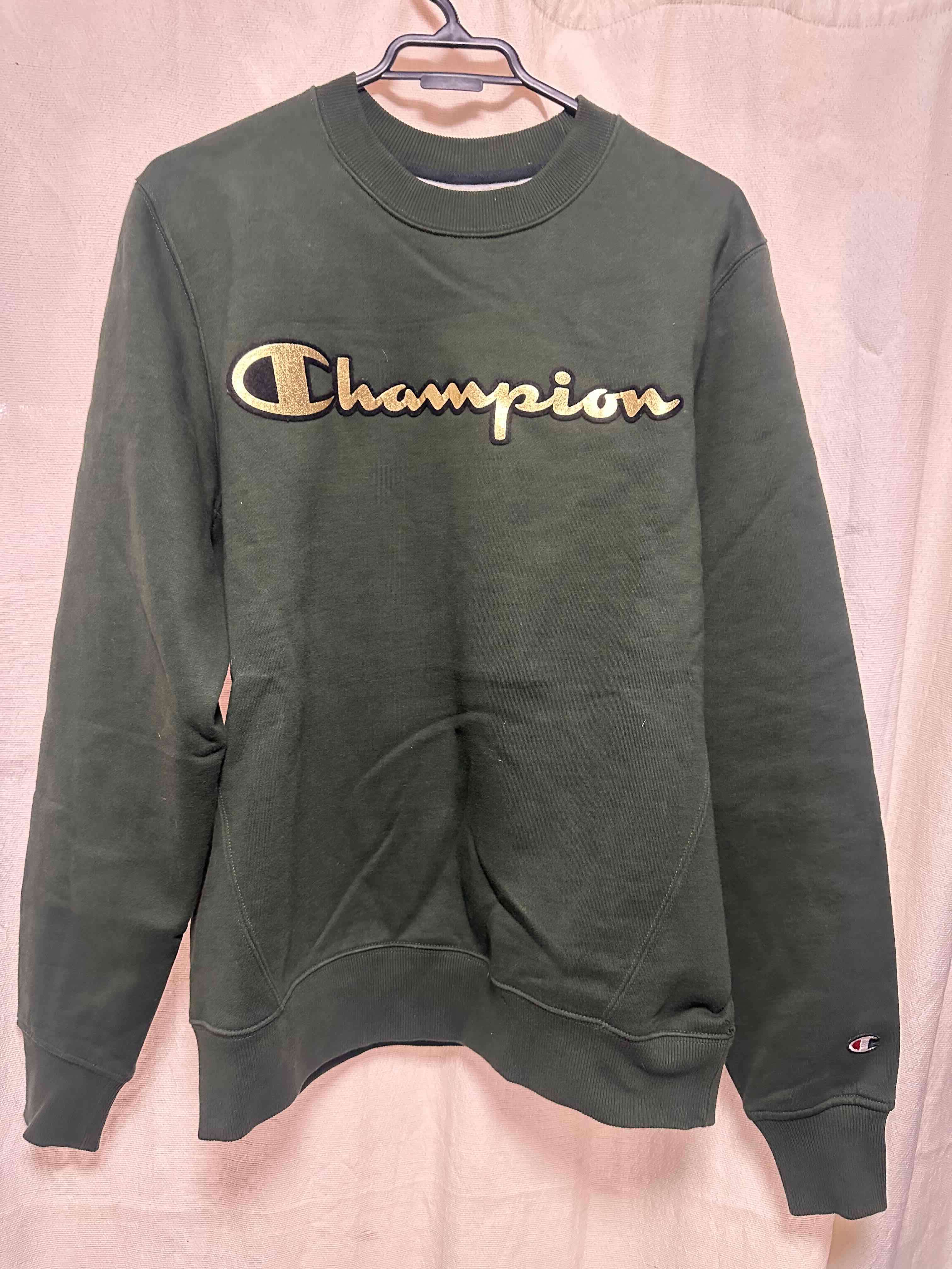 Polerón de algodón verde oscuro con logo Champion dorado, ideal para días fríos. En buen estado general con signos leves de uso. Tiene un detalle en la pretina. 3 usos