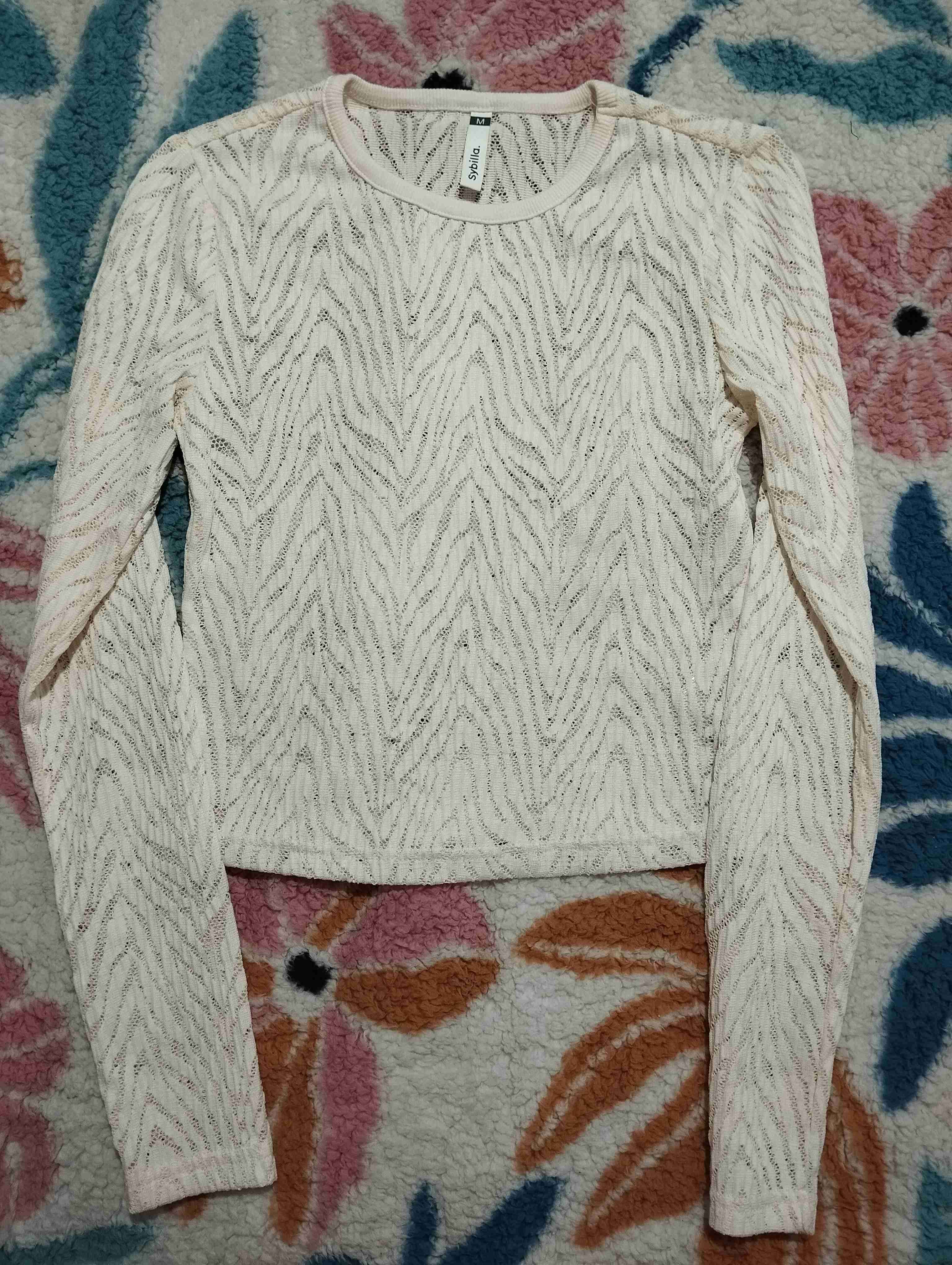 Polera Sybilla color marfil, manga larga y cuello redondo. Tiene un diseño de tejido con textura de zigzag. Es ideal para un look casual en media estación o de día. Fresquita y versátil. Largo 45cm, ncho hombros 31cm, cintura 36cm.