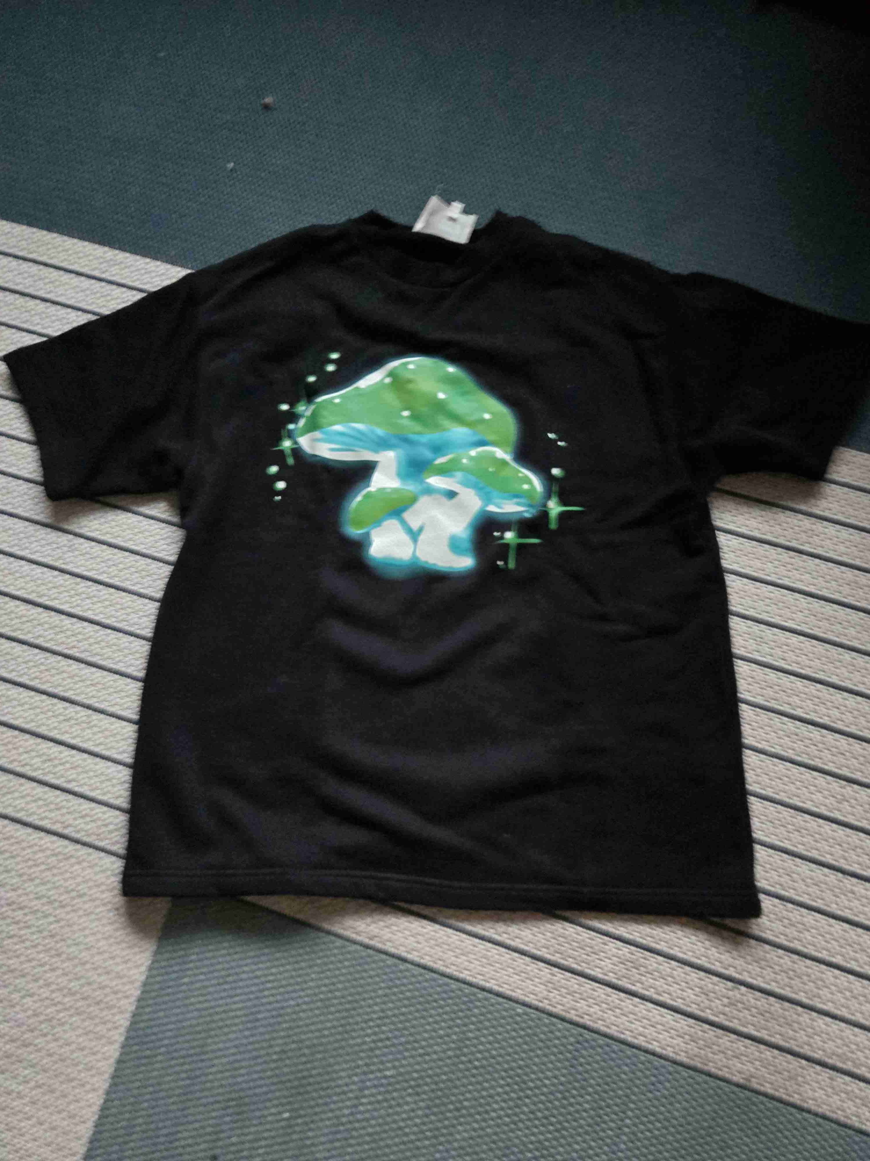 Polera negra de manga corta con dibujo de hongo verde en el frente. Ideal para usar casualmente. En buen estado.