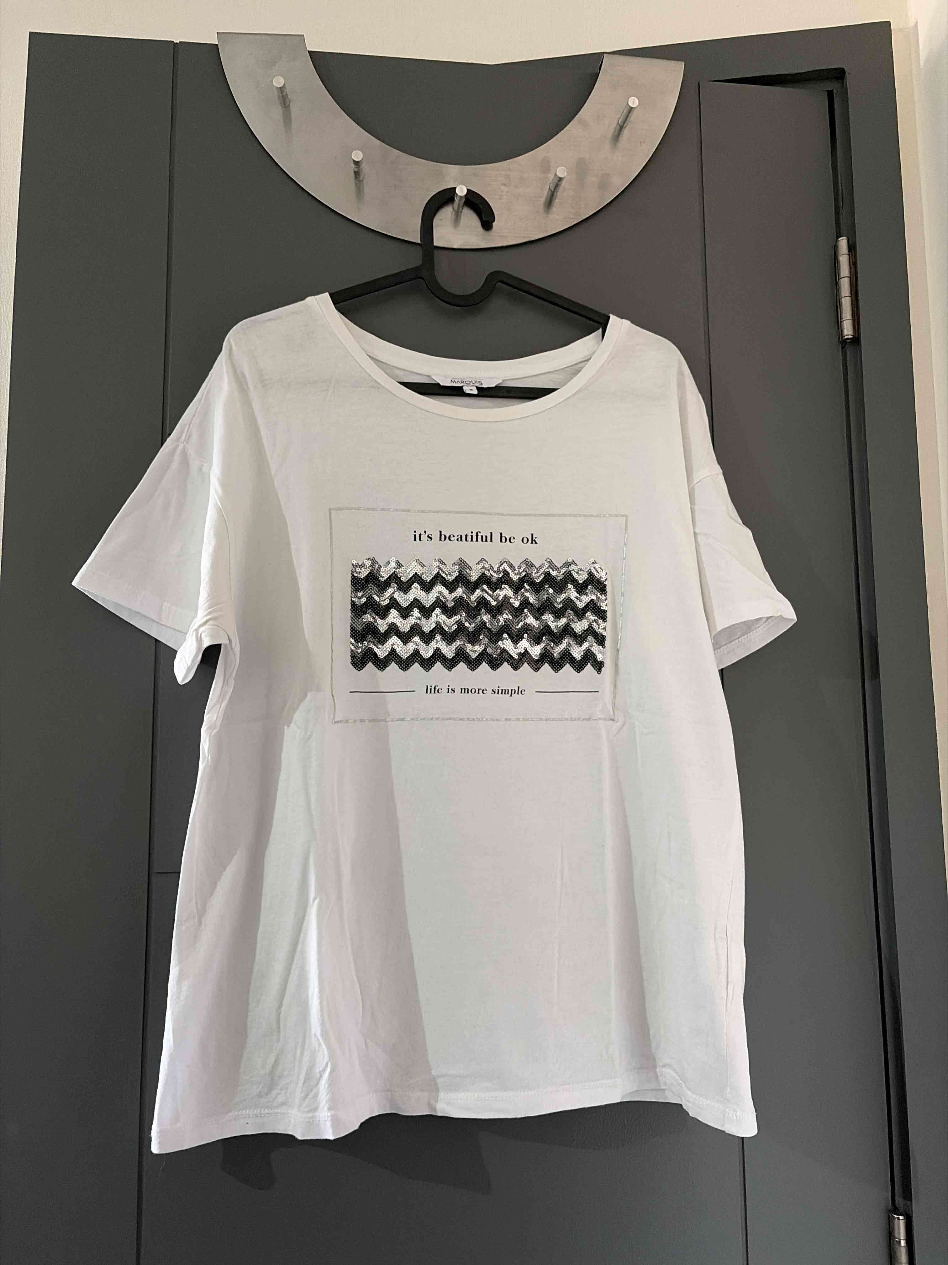 Polera blanca con diseño de lentejuelas geométrico. Ideal para uso casual, en buen estado. Talla S Impecable . Marca Marquis
