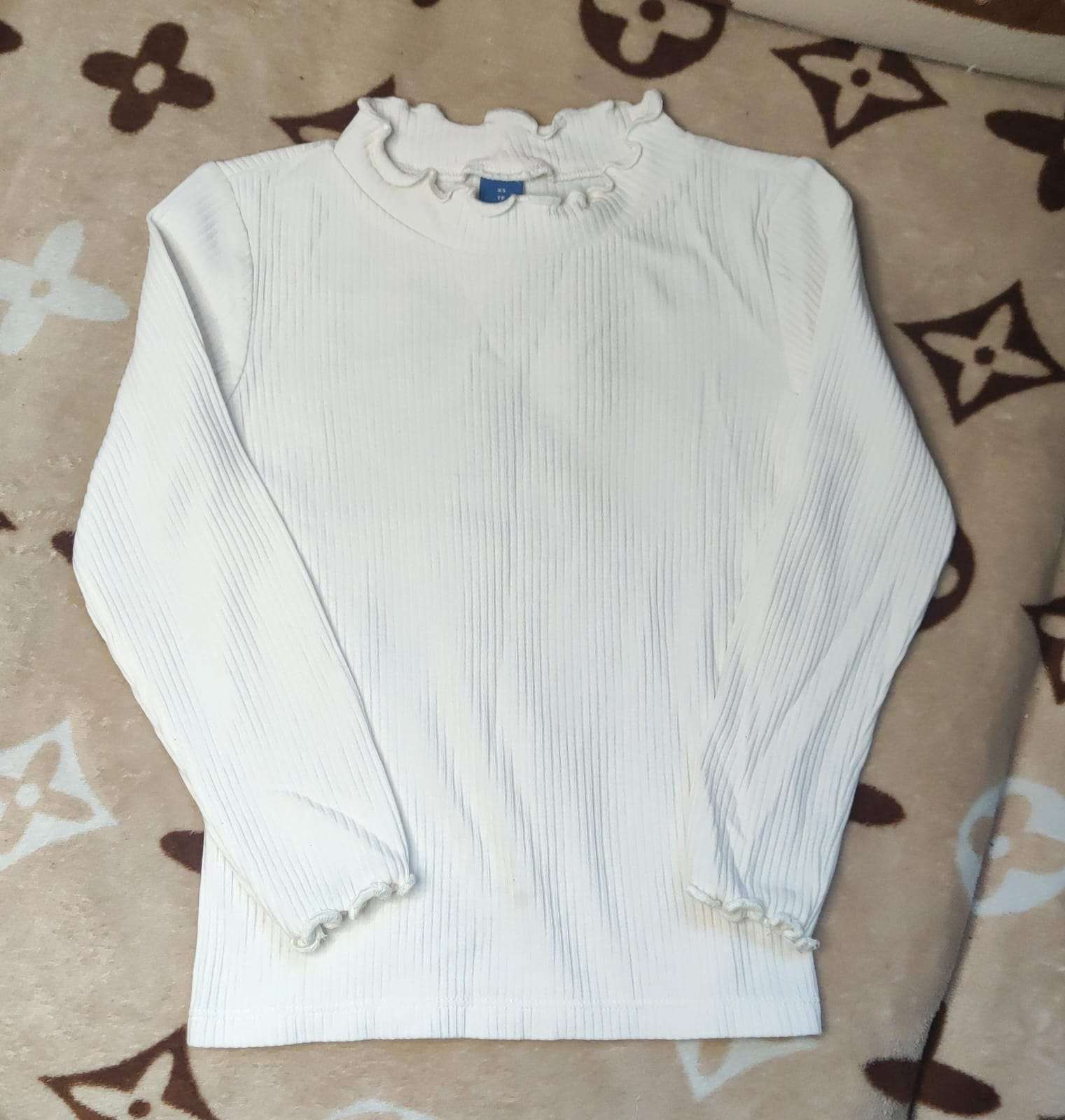 Polera blanca con cuello alto y diseño ribeteado en las mangas. Perfecta para combinar en otoño o invierno. Talla 5