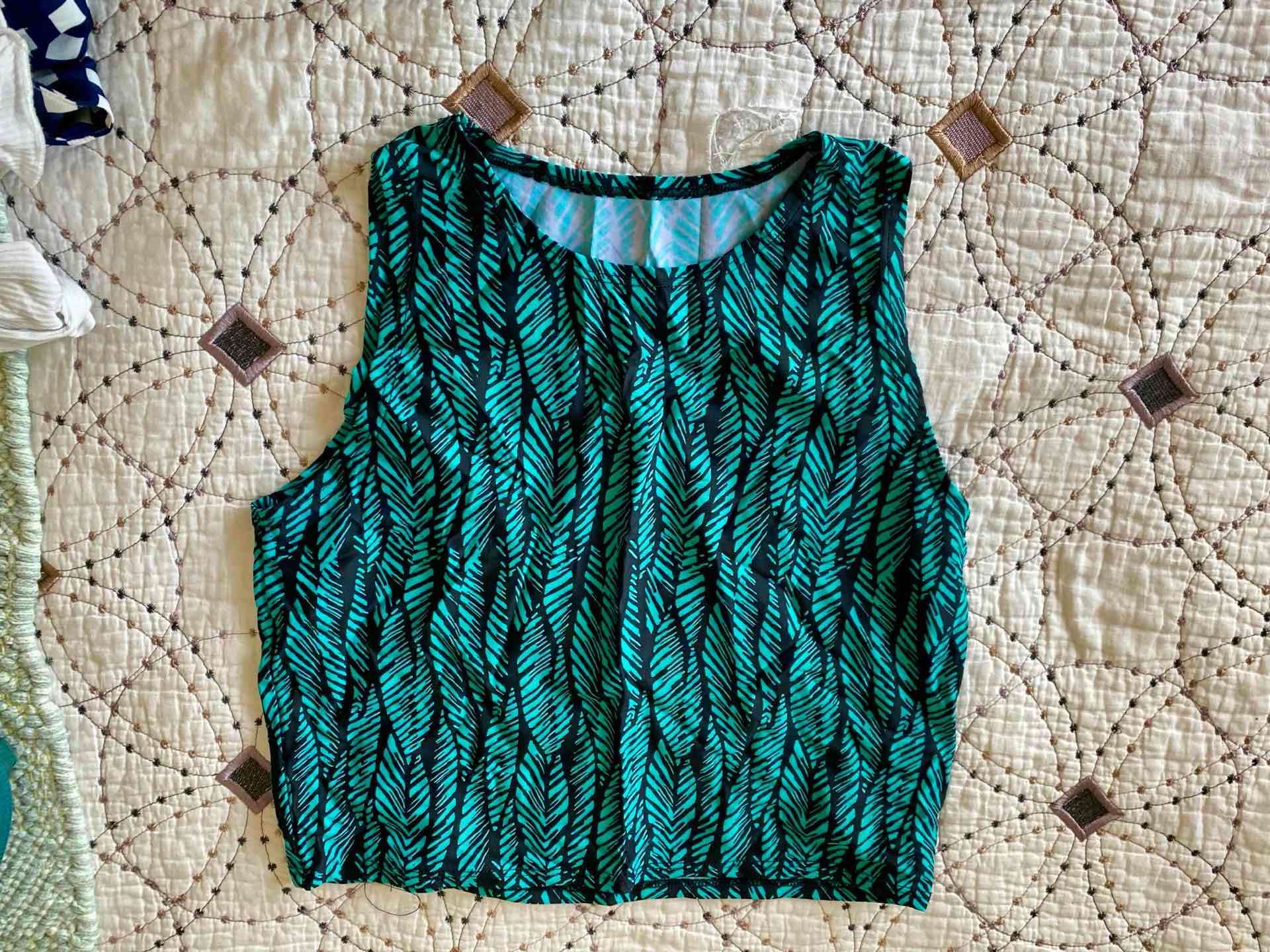 Polera sin mangas en buen estado, con estampado de hojas en tonos verde y negro. Ideal para verano.