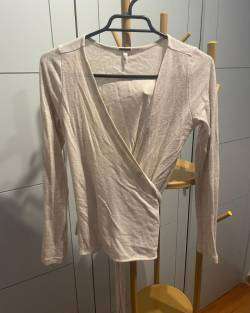 Polera manga larga entallada, cruzada, marca Lolita Pocket, tejido delgado tipo jersey, color beige, con lazos para amarrarlo atrás o cruzado hacia adelante. Para usarla sola en forma escotada o con un top básico abajo, talla S. SIN USO, SIN ETIQUETA