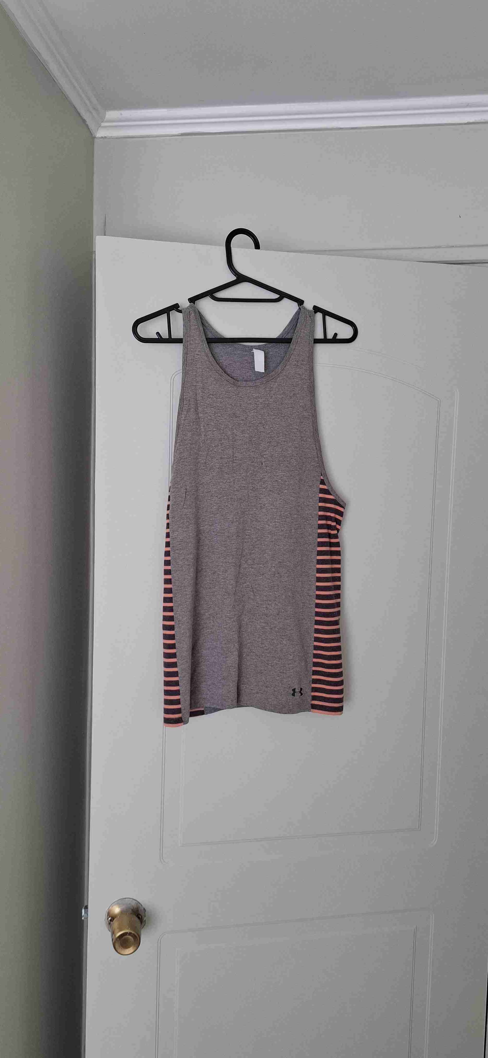 Polera under armour sin mangas, ideal para deporte. En buen estado, color gris con rayas rojas laterales.