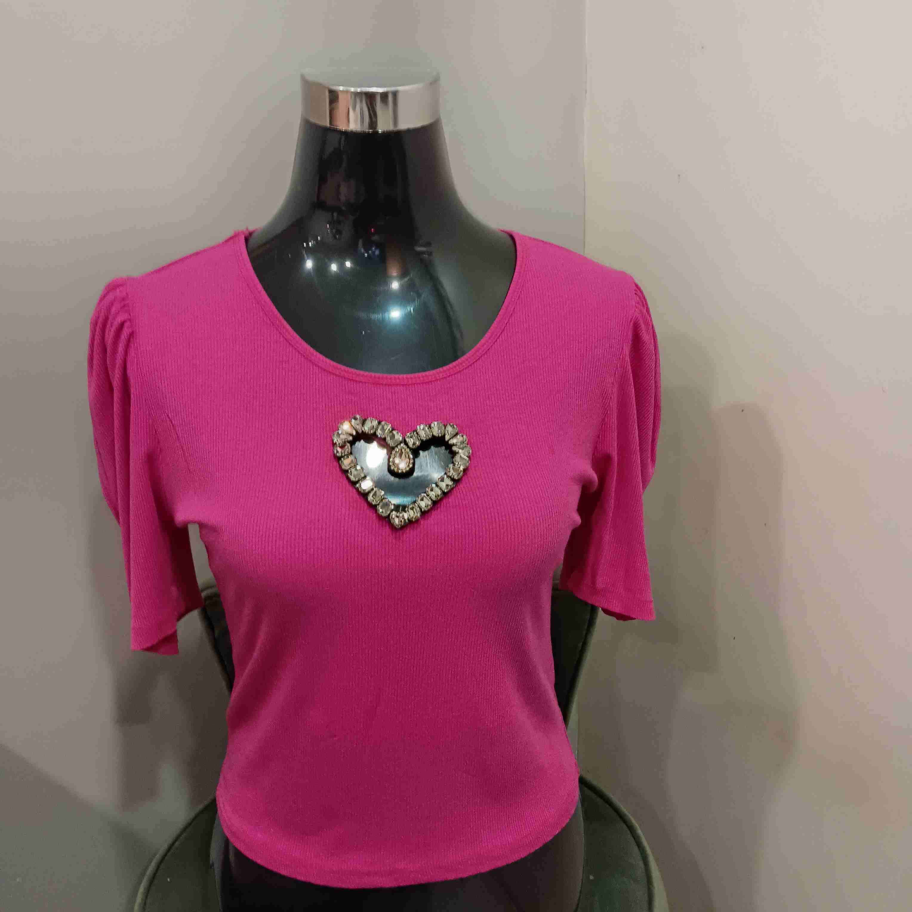 Polera fucsia con aplique de corazón brillante, ideal para un look casual. Manga princesa. El color fucsia te da poder y confianza, activan la dopamina y es el color que dice me quiero y por eso brillo.