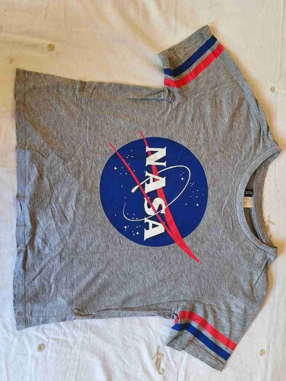 Polera gris con logo de NASA y detalles en las mangas. Ideal para looks casuales.
