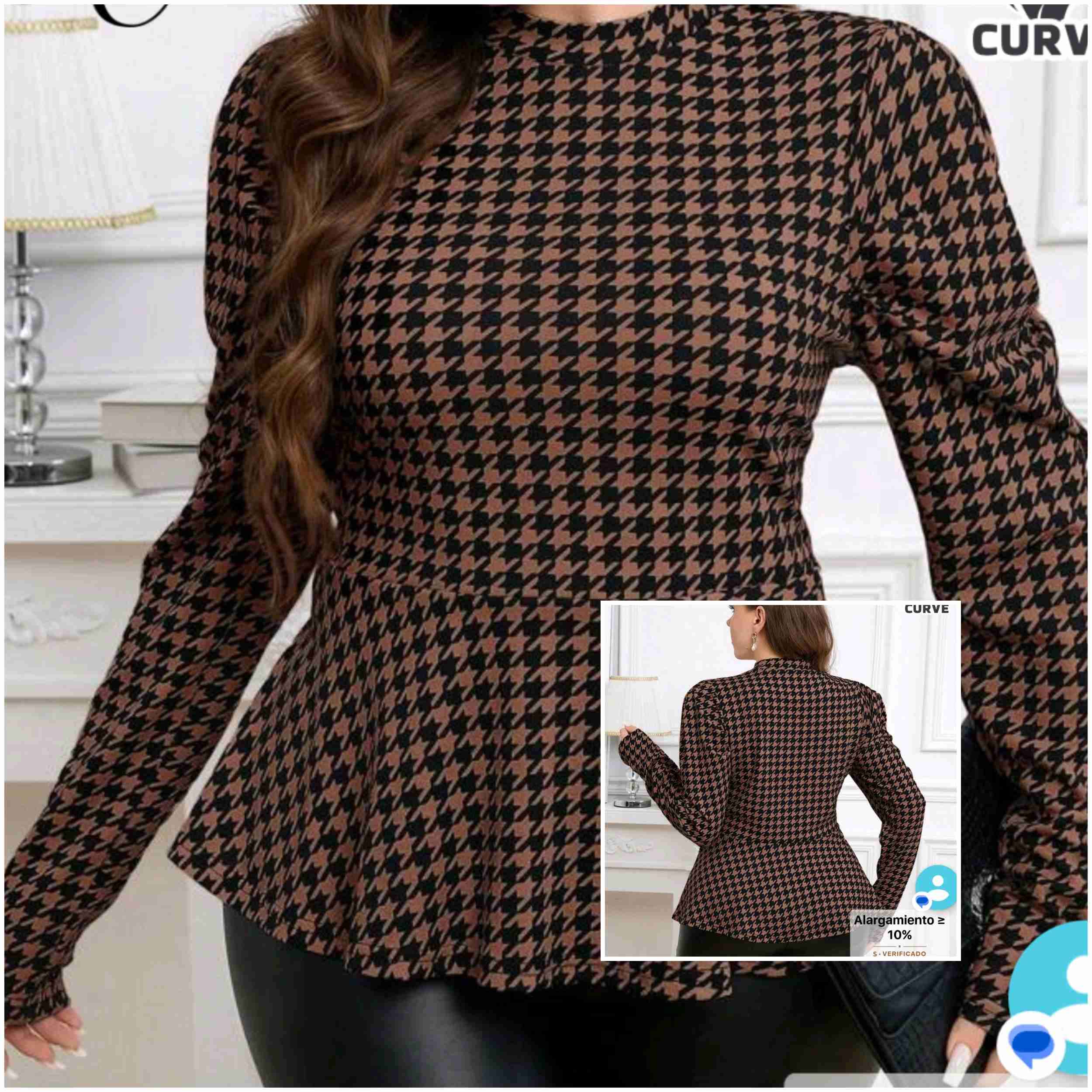 Blusa elegante de manga larga de shein con estampado pata de gallo, perfecta para ocasiones especiales. NUEVA