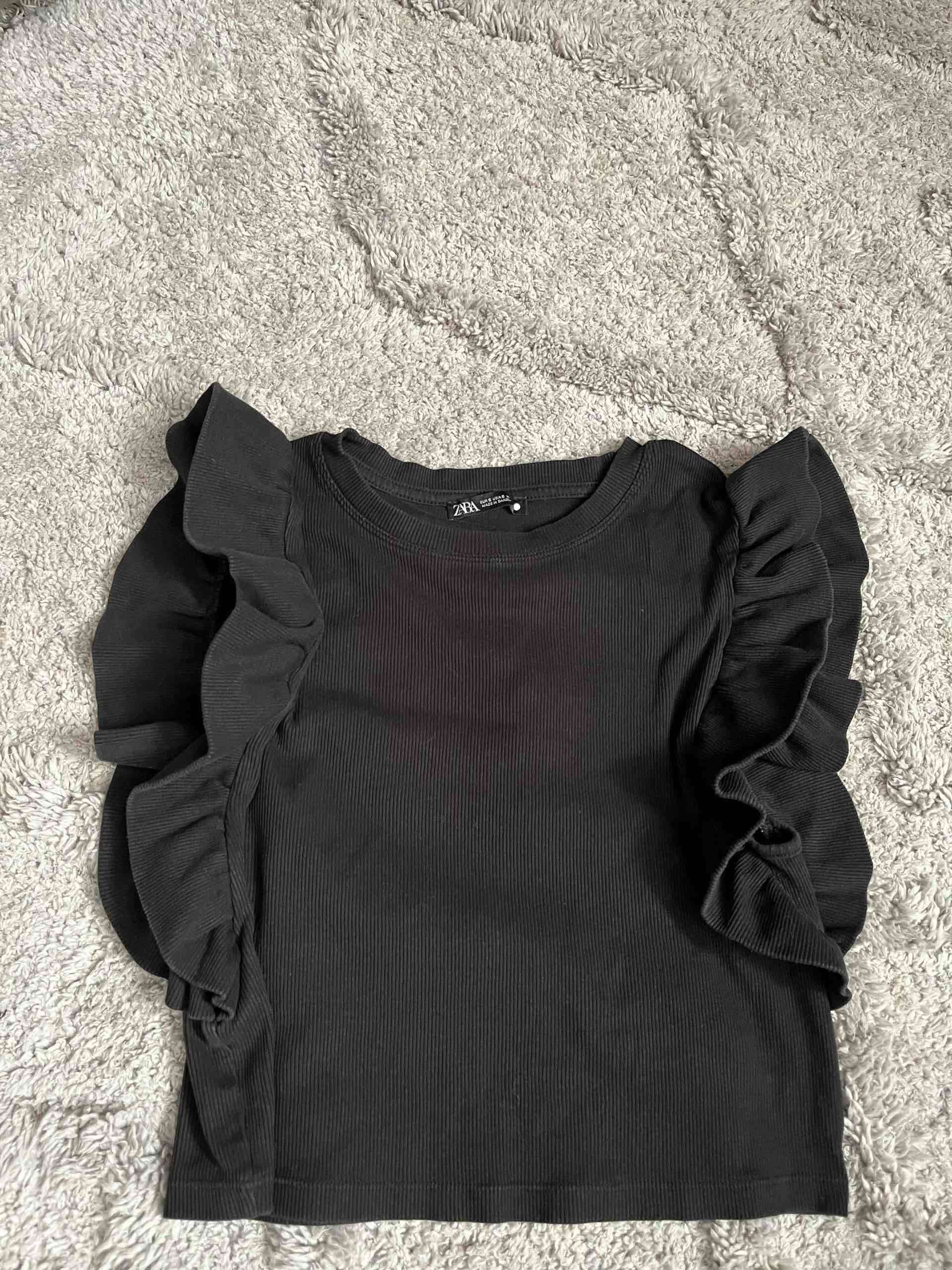 Polera negra con detalles de vuelos en los hombros, estilo casual y juvenil. En buen estado. Sin detalles solo uso