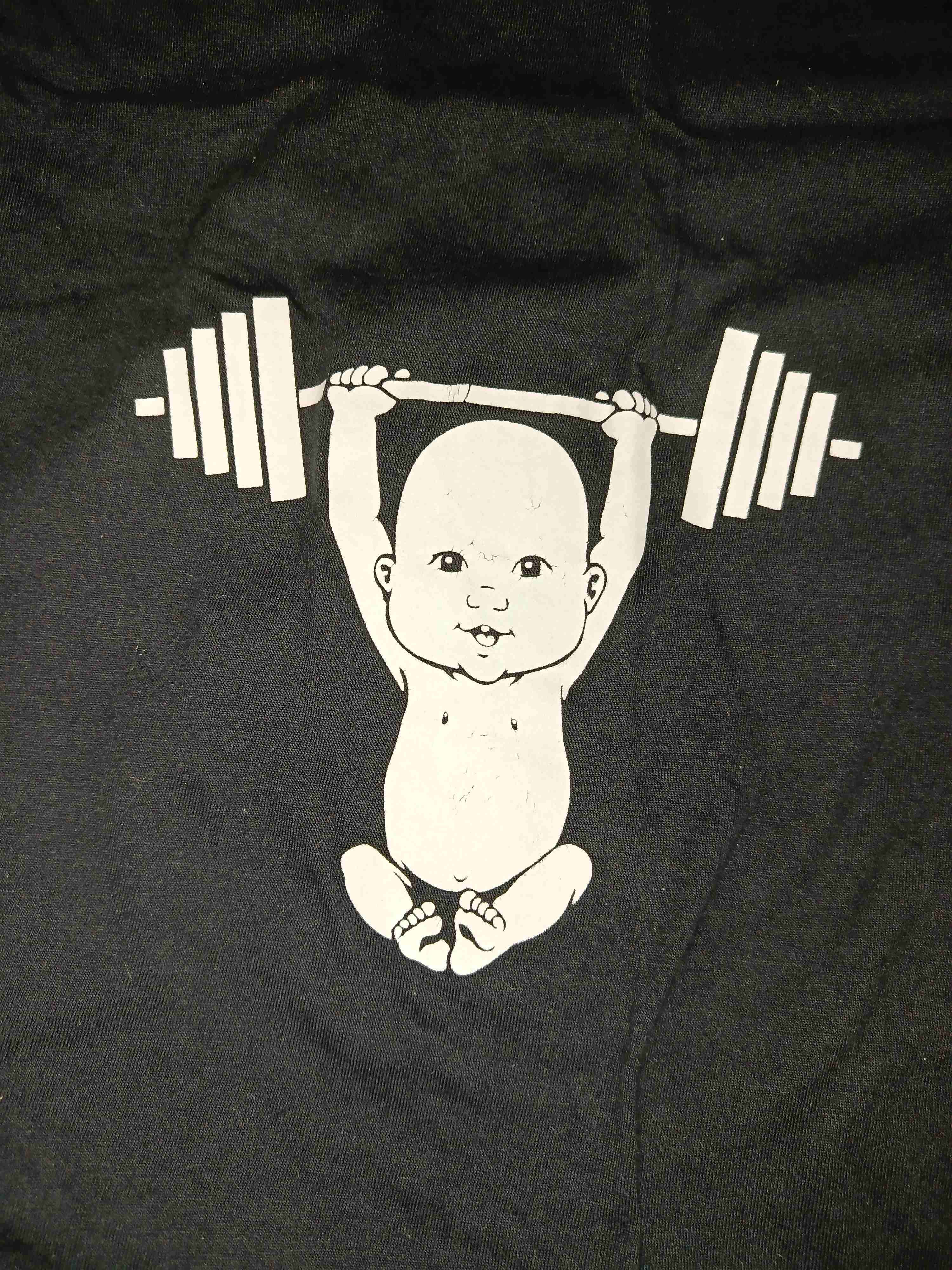 Polera negra 100% algodón con diseño divertido de bebé levantando pesas. Talla M holgada y cómoda para embarazadas, tiene pequeños pliegues en los bordes de los costados para dar forma.