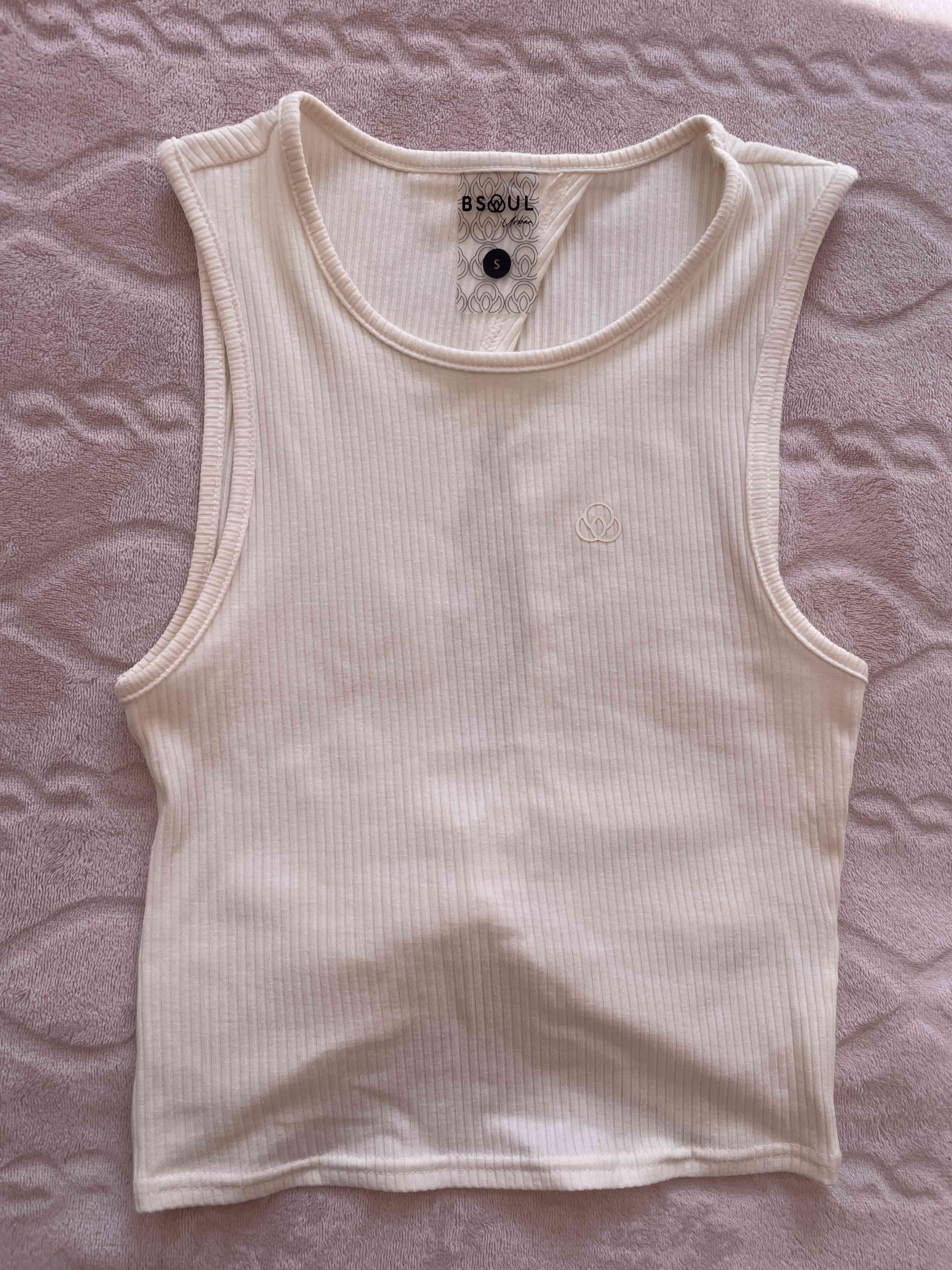 Polera sin mangas de color beige, estilo casual y tejido acanalado. En buen estado, ideal para días cálidos o para usar debajo de chaquetas.