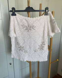 Polera Zara tejida en hilo, con flores en mostacilla, cuello bote amplio, talla M, delicada, romántica, muy linda. UN SOLO USO, EXCELENTE ESTADO