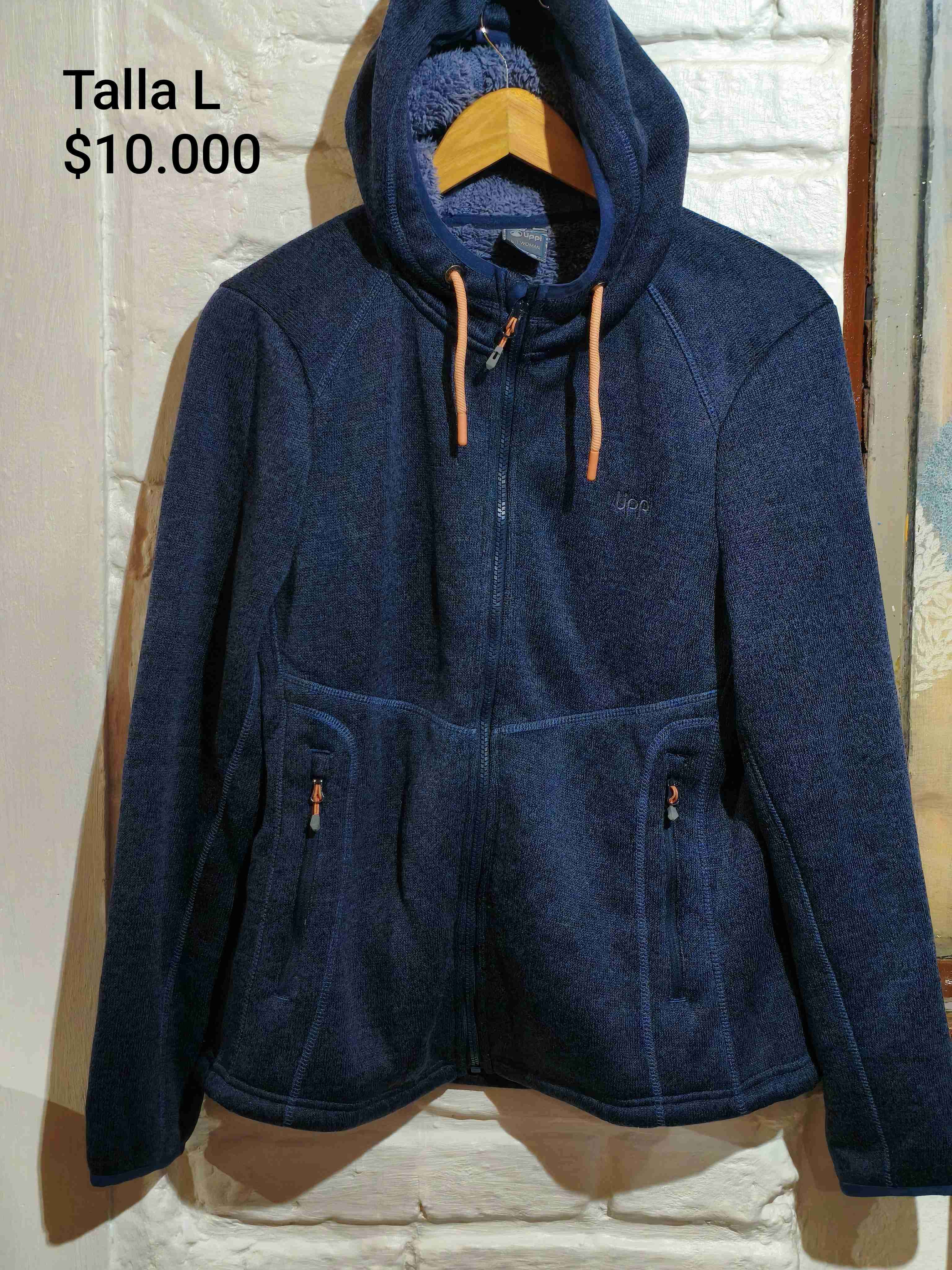 Abrigo azul con cierre y capucha, ideal para invierno. Tamaño L, en buen estado general con ligeros signos de uso.
