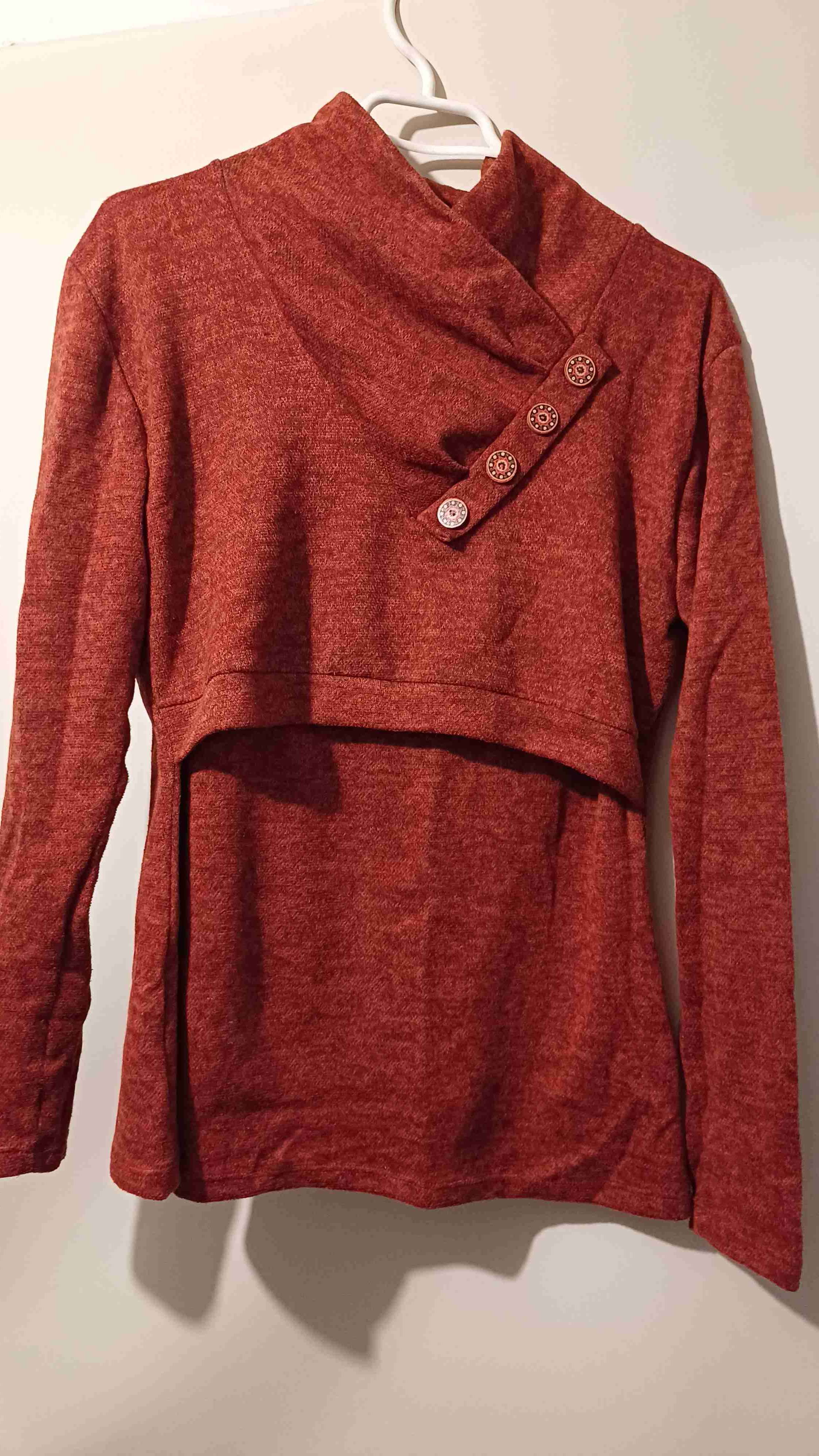 Sweater de lanilla en tono rojo, estilo casual, con botones decorativos en el cuello. Ideal para el otoño. En buen estado.