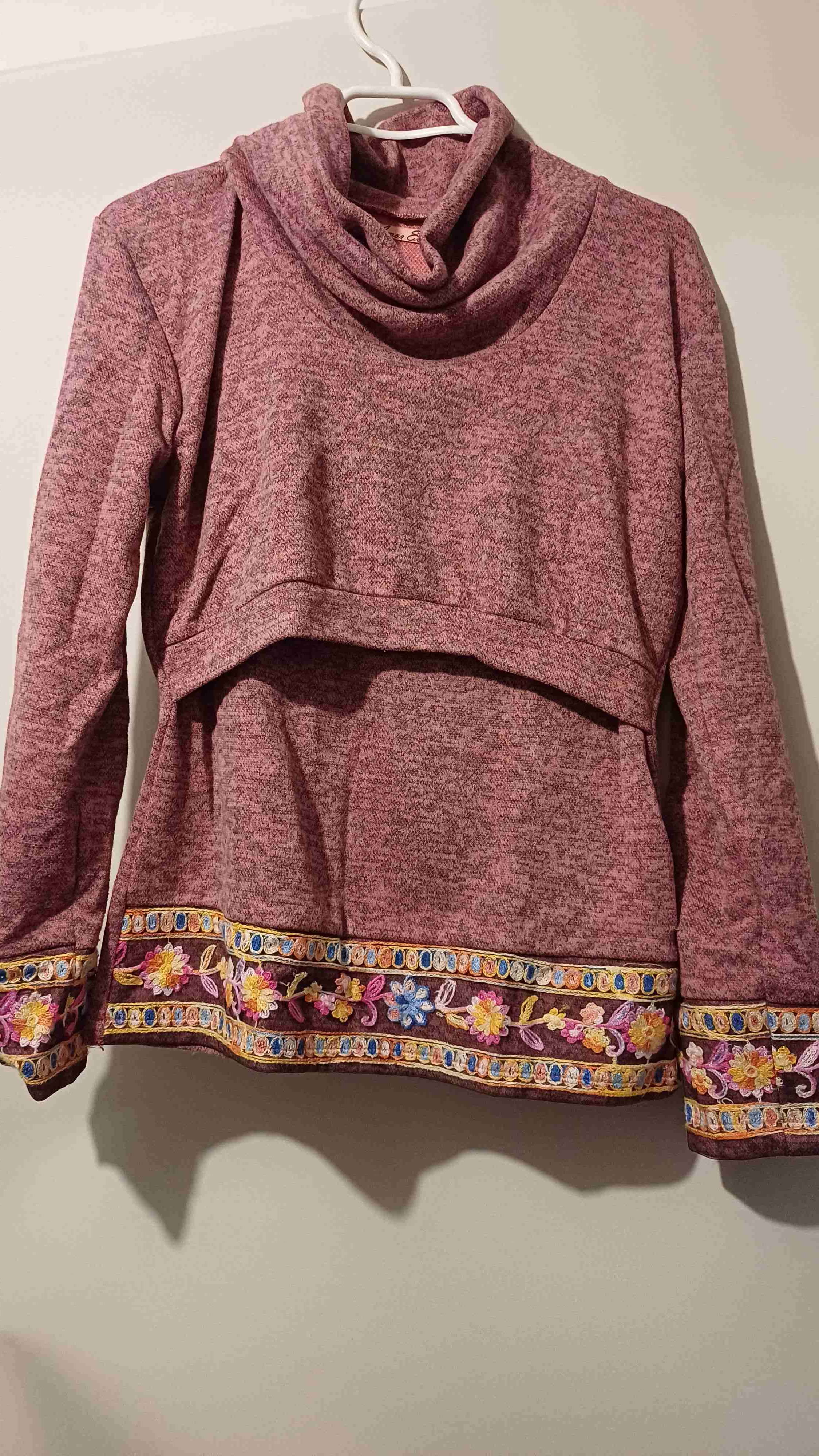 Poleron maternal color palo rosa con detalles florales bordados en el bajo y mangas. En buen estado, poco uso, ideal para días frescos.