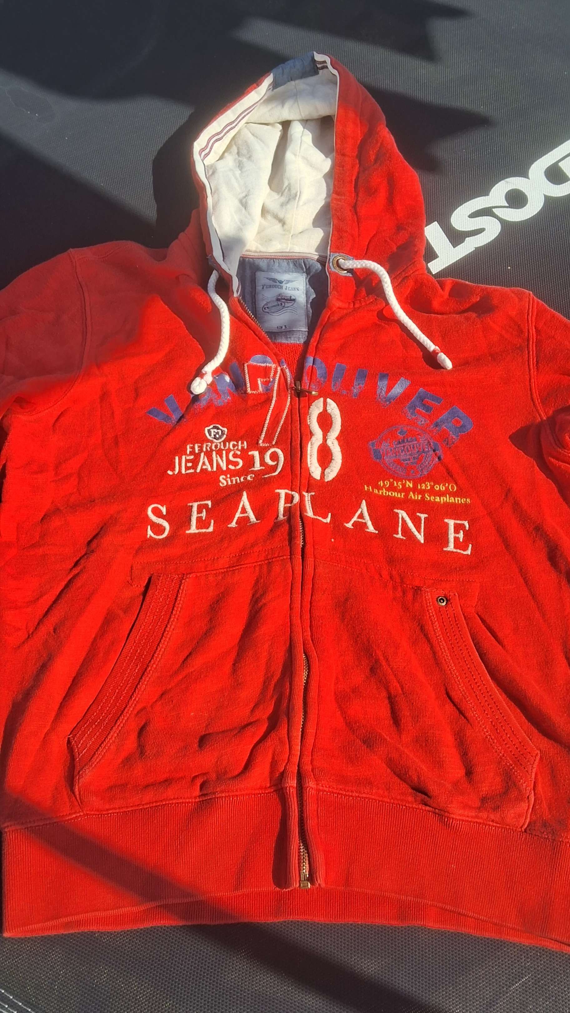 Cómodo polerón rojo con capucha y cierre. Ideal para días fríos. En buen estado general, con leves signos de uso.