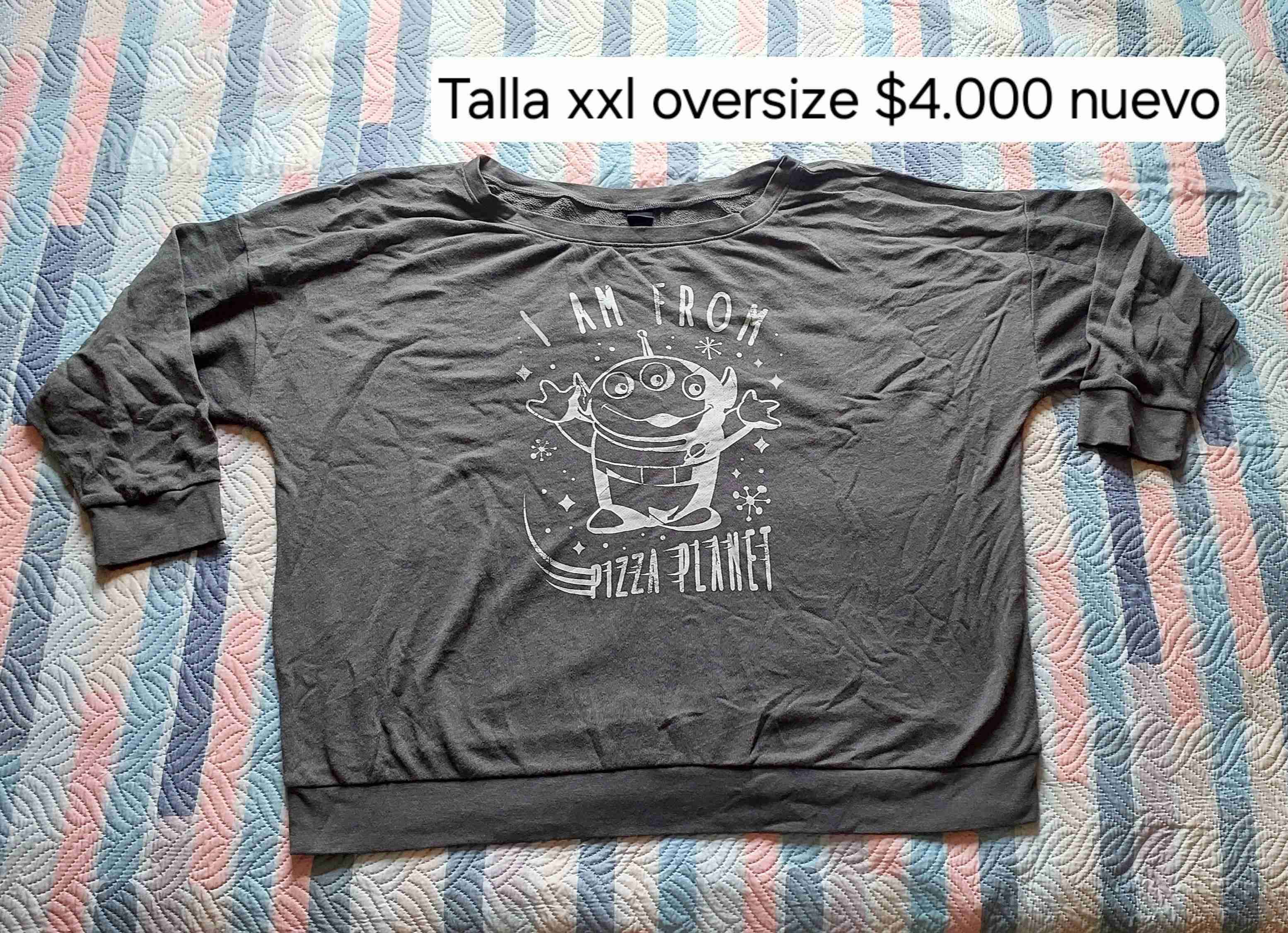 Poleron oversize gris con diseño de Pizza Planet. Ideal para un look casual y cómodo. Nueva sin uso. Talla xxl