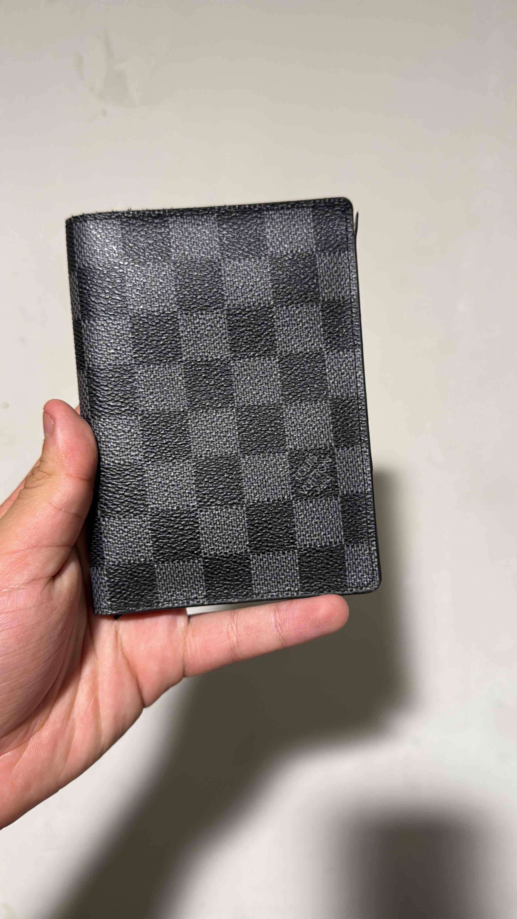 Elegante porta pasaporte de cuero, color negro con diseño a cuadros. Perfecta para uso diario. No sé si es original.