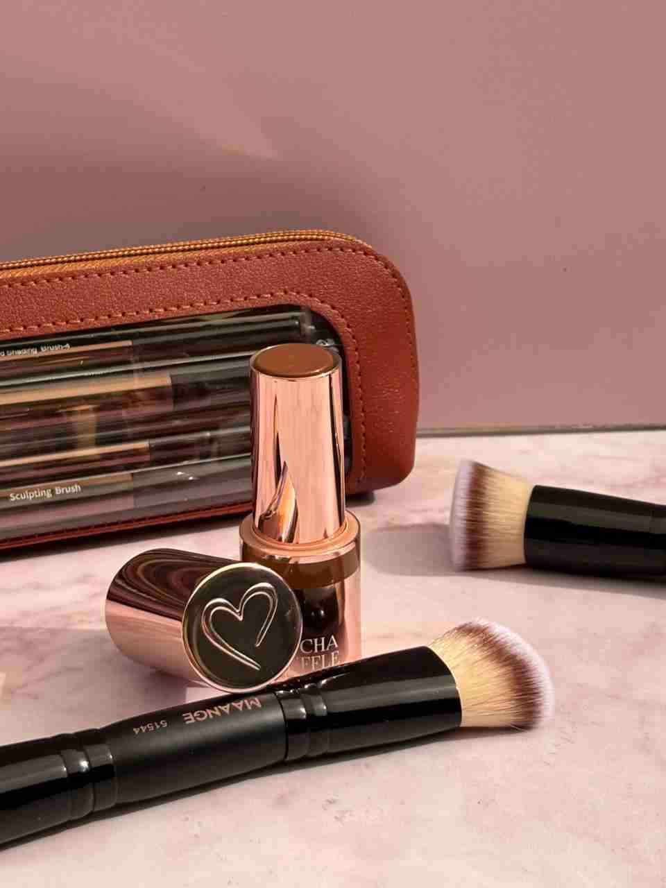 Elegante set de brochas para maquillaje en estuche marrón, ideal para el uso diario. En buen estado, perfecto para regalar o regalonearte. Estado - NUEVO