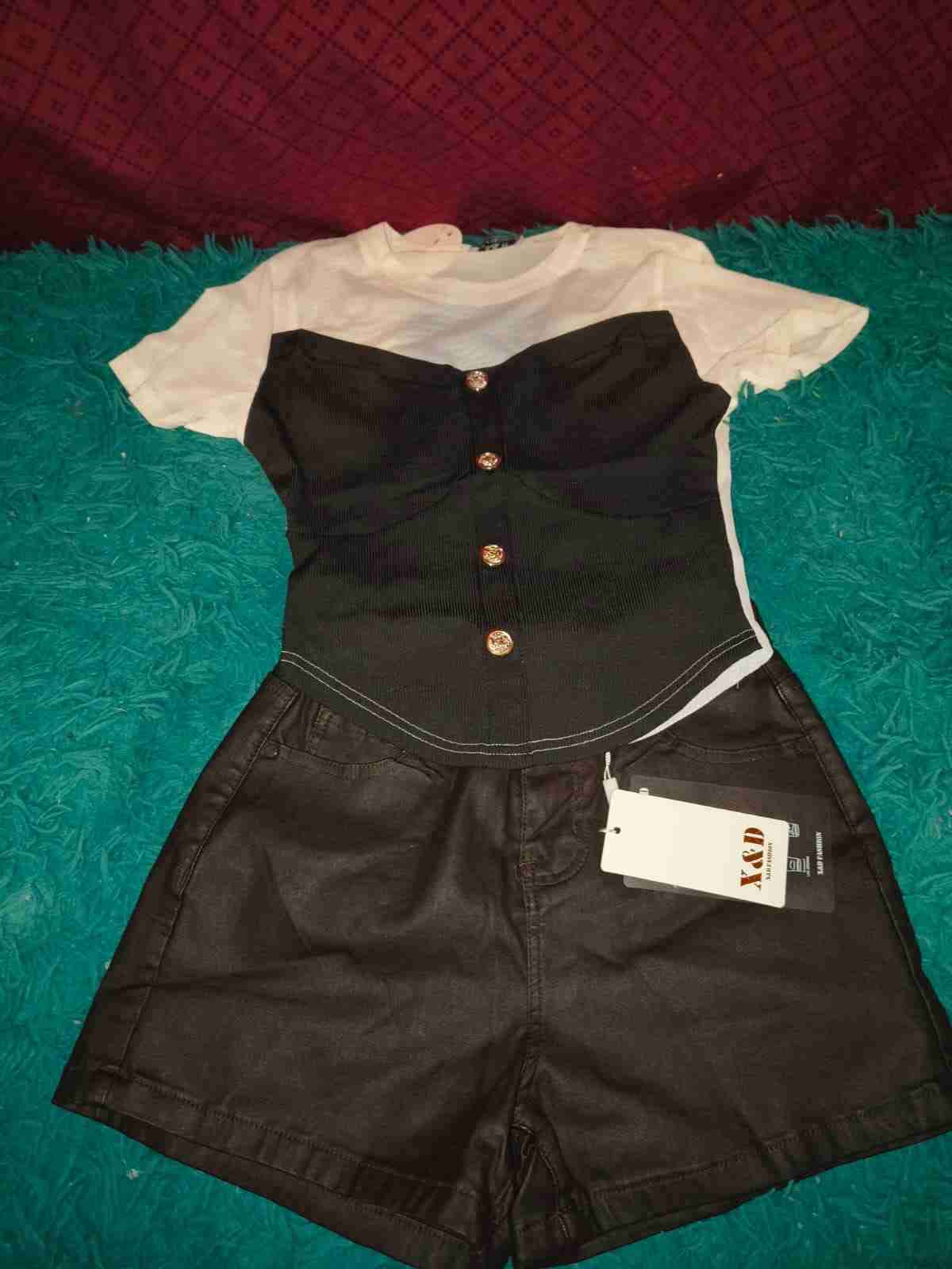 Conjunto de short negro con polera blanca y corset negro. Ideal para un look casual y cómodo. Nuevo con etiqueta.
