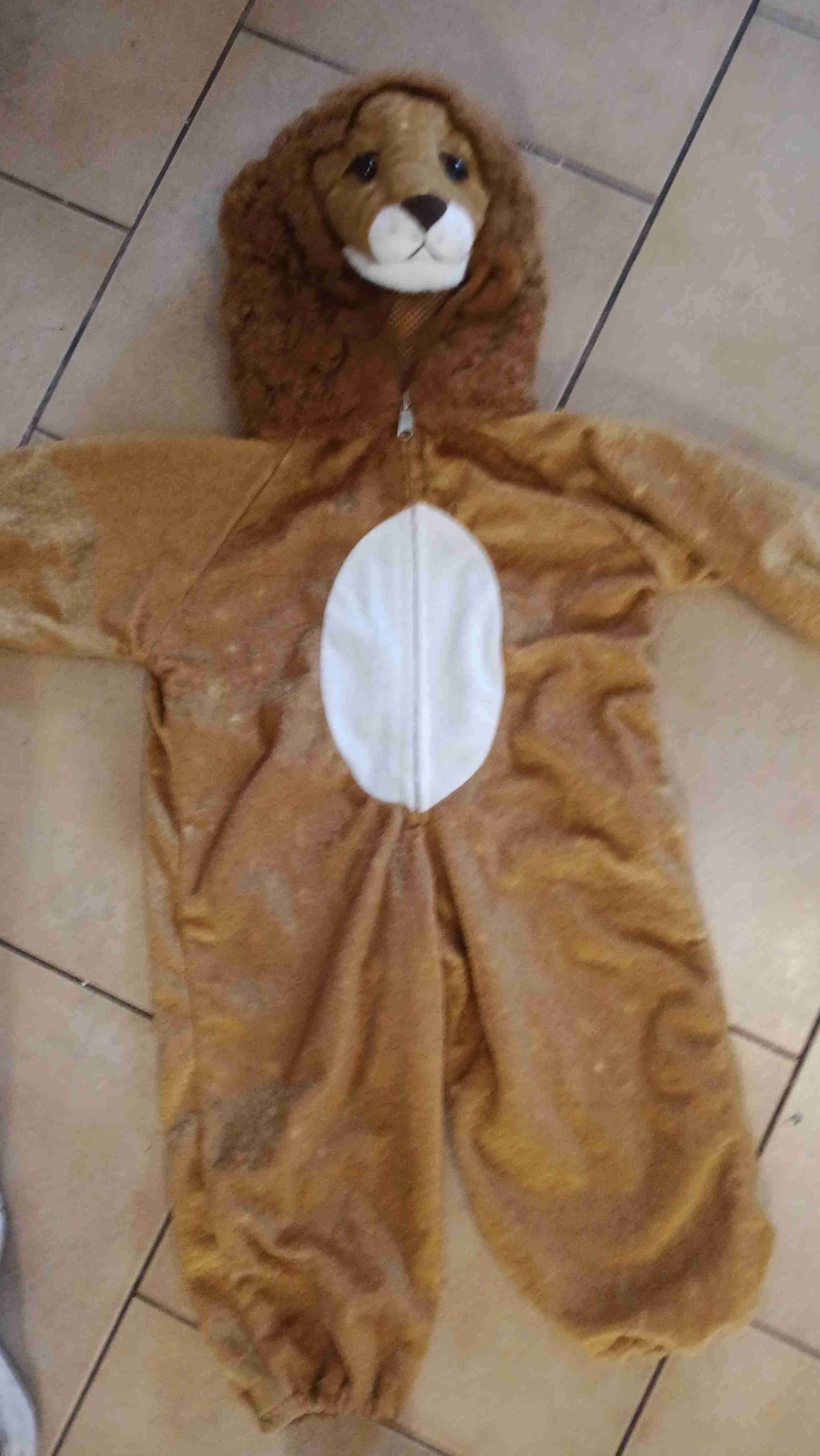 Disfraz de león con capucha y cierre frontal. Ideal para fiestas y eventos escolares. Buen estado general. Talla 3-4