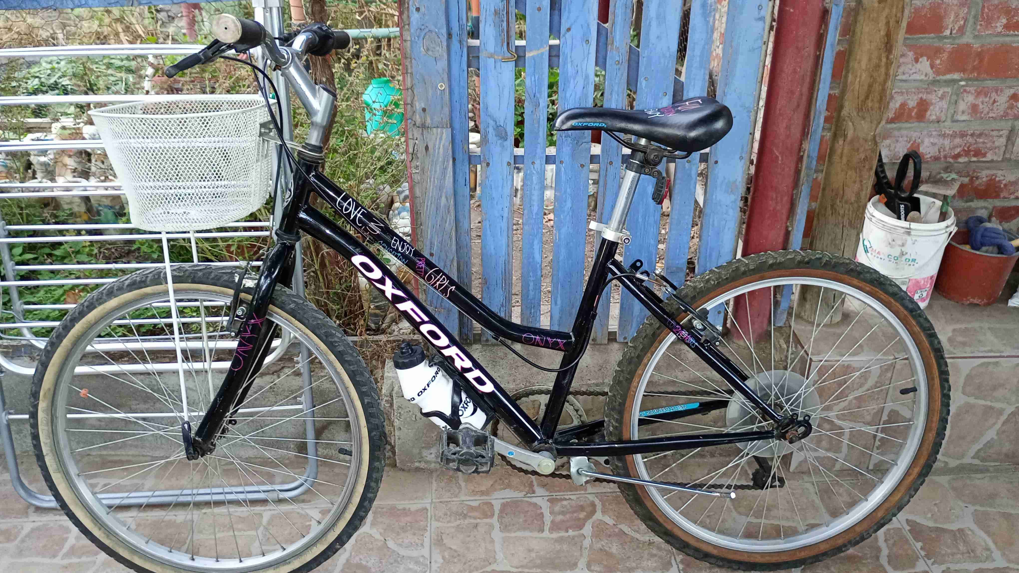 Bicicleta urbana Oxford aro 24 en buen estado. Perfecta para paseos por la ciudad, incluye canasto frontal blanco y botella para agua.