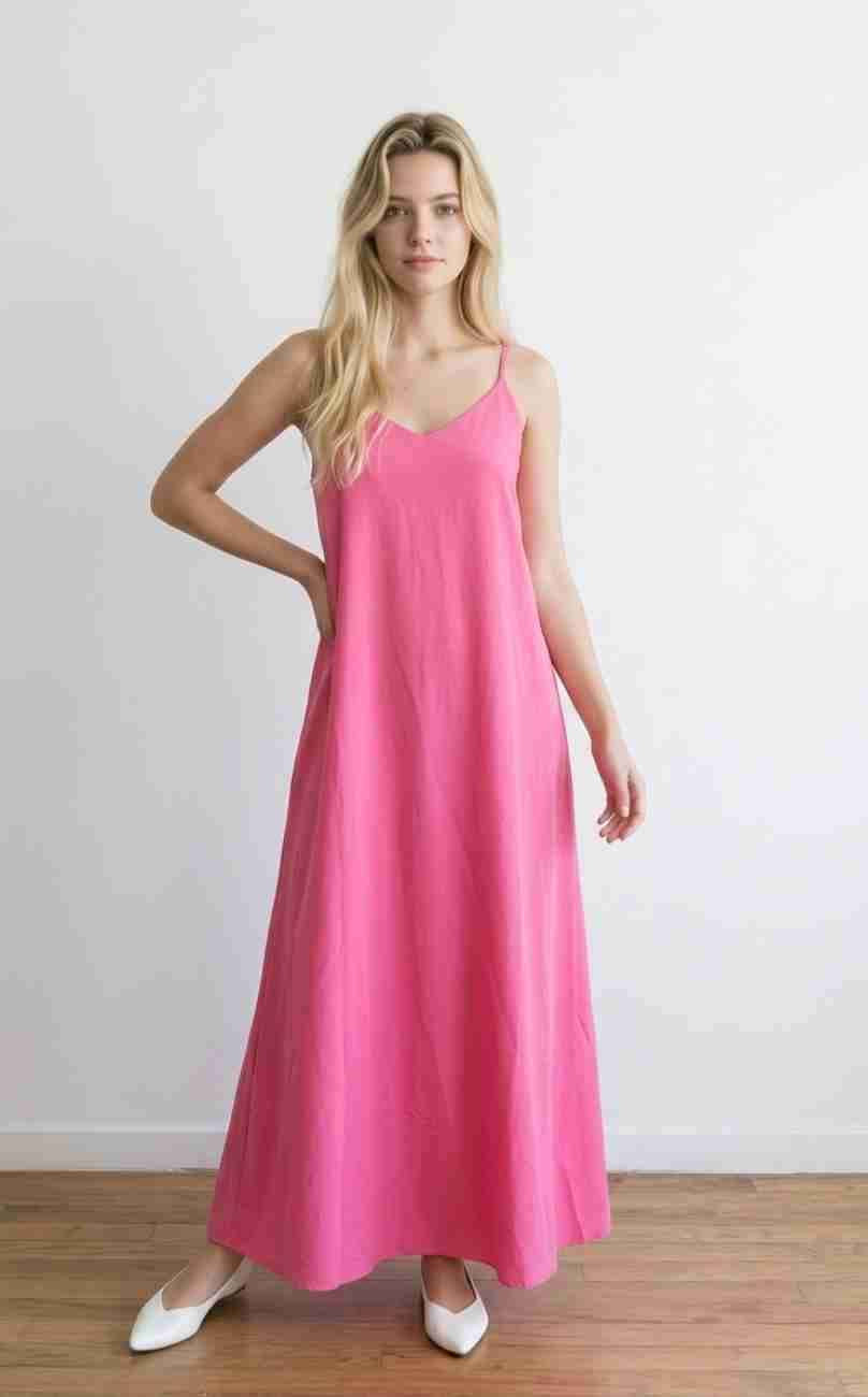 Vestido largo en color fucsia, ideal para el verano. Sin mangas y estilo sencillo, perfecto para salidas casuales. En buen estado.