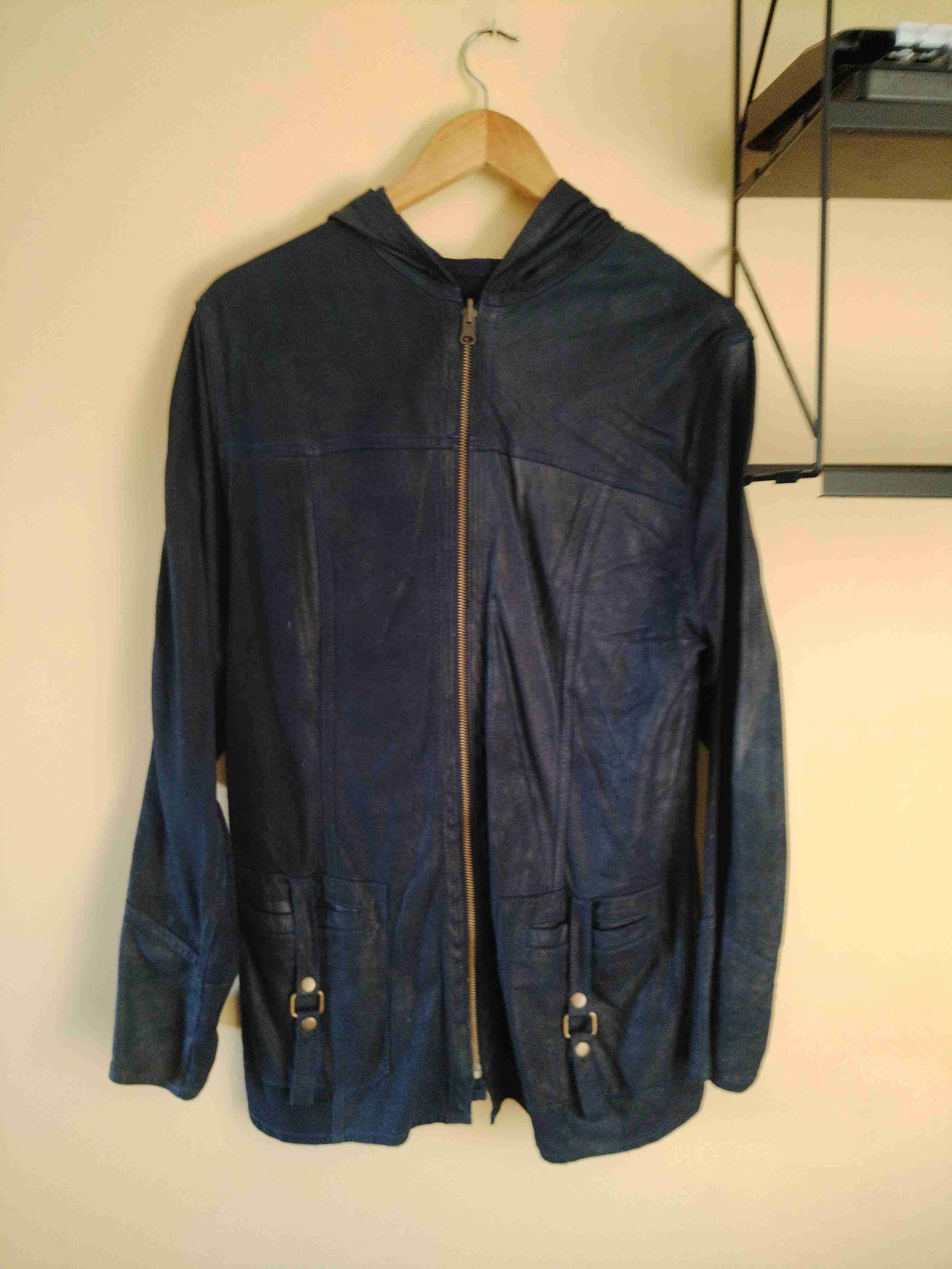 Elegante chaqueta de cuero azul oscuro con cierre frontal. Ideal para días fríos, en buen estado.