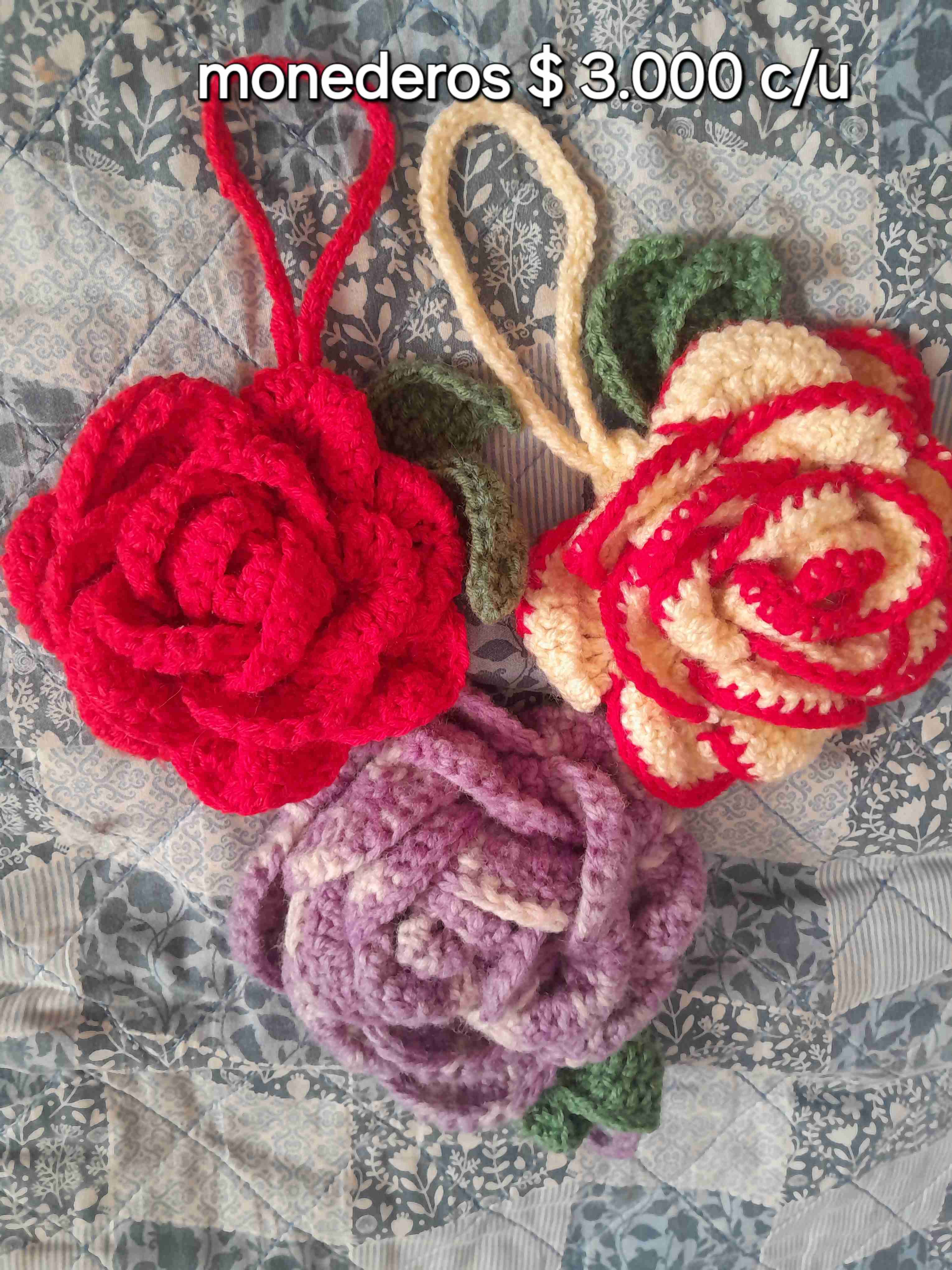 Hermosos monederos tejidos a mano con diseño de flor, ideales para un toque especial. En buen estado, variados colores.