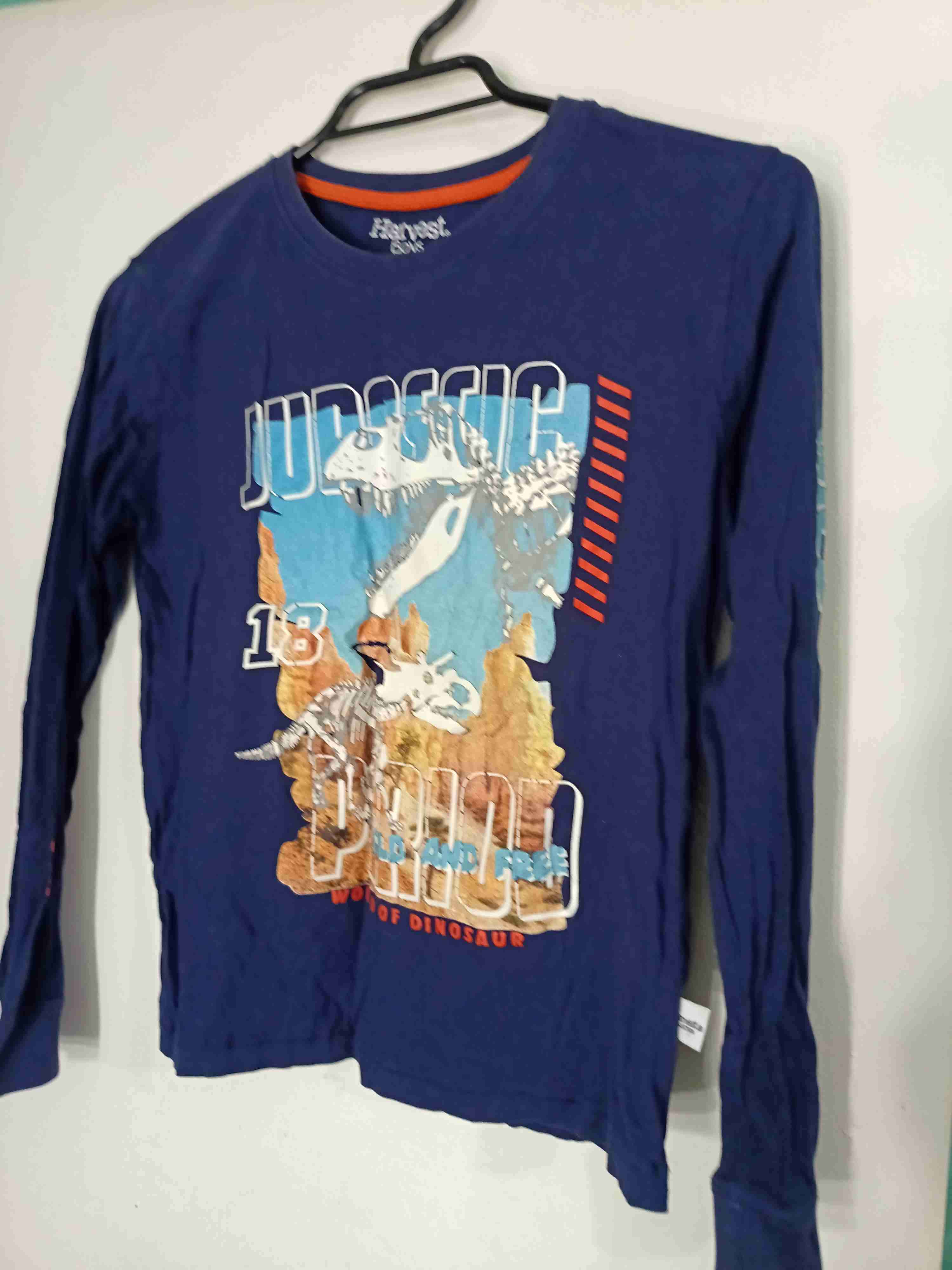 Polera azul con gráfico de dinosaurio, ideal para niños. En buenas condiciones con poco uso. Harvest talla 10 8