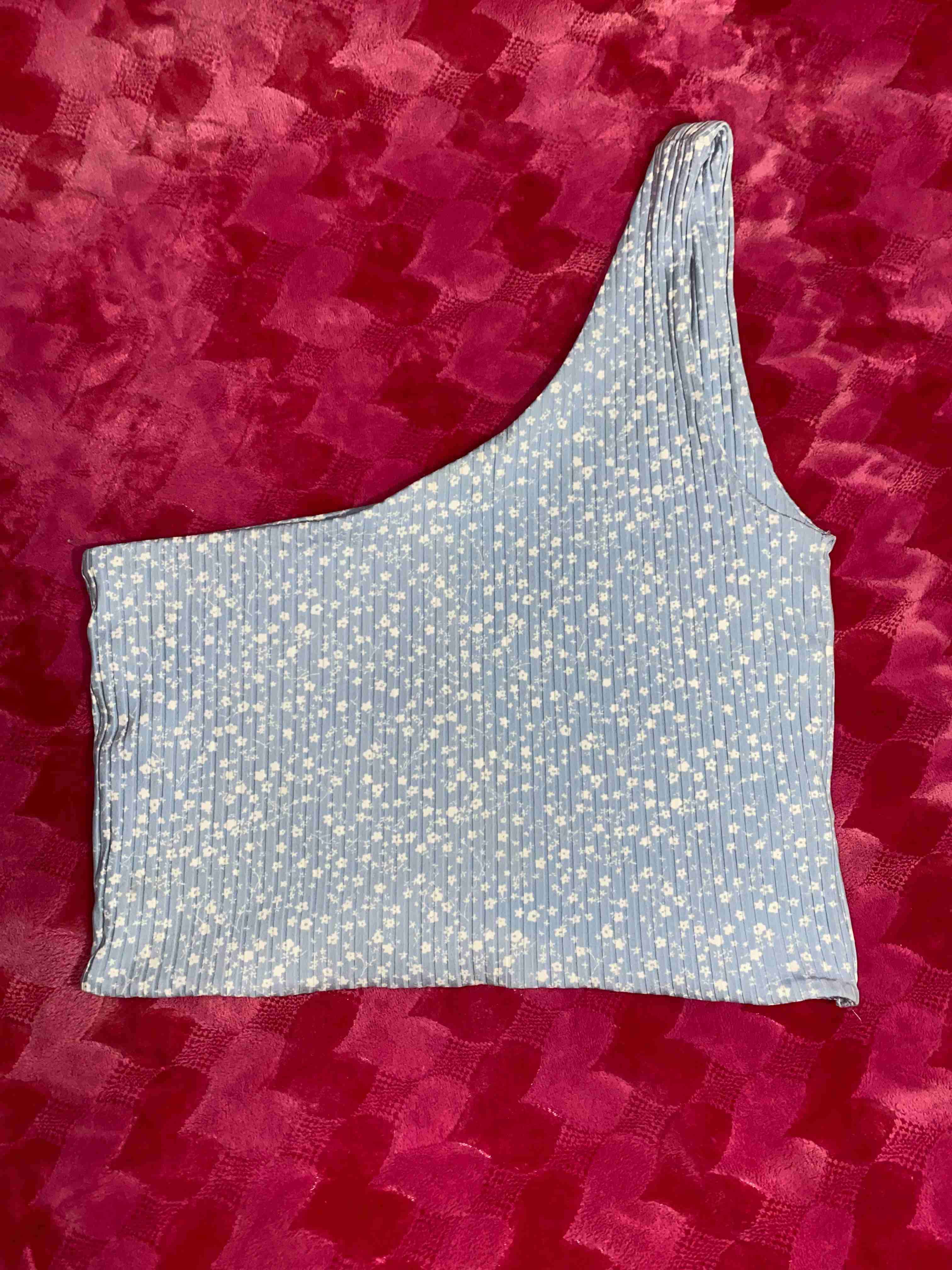 Top asimétrico azul con diseño floreado, ideal para un look casual. En buen estado con poco uso. Lo uso una persona que normalmente usa talla M