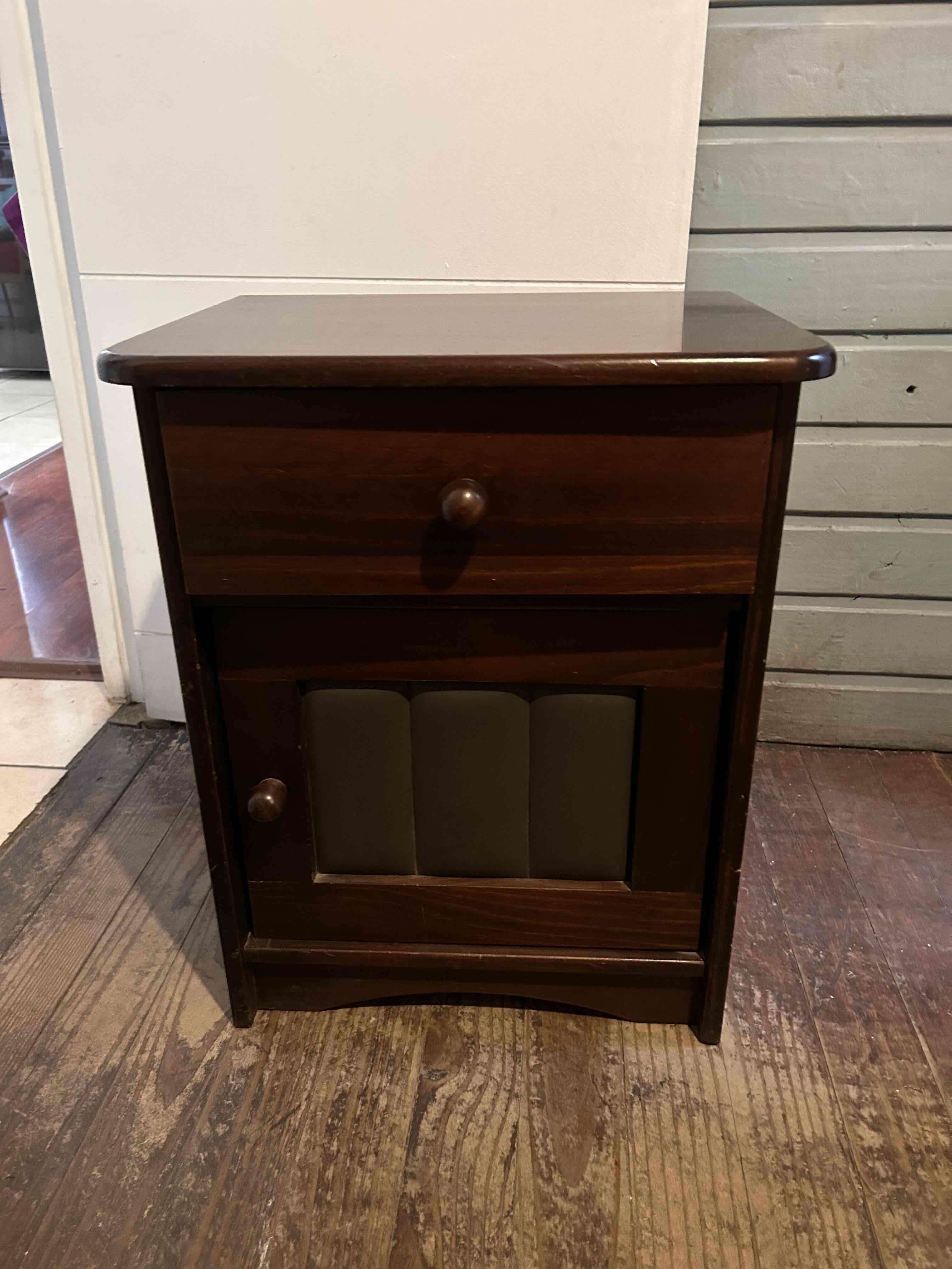 Velador de estilo clásico en madera, ideal para dormitorio. En buen estado con leves signos de uso.