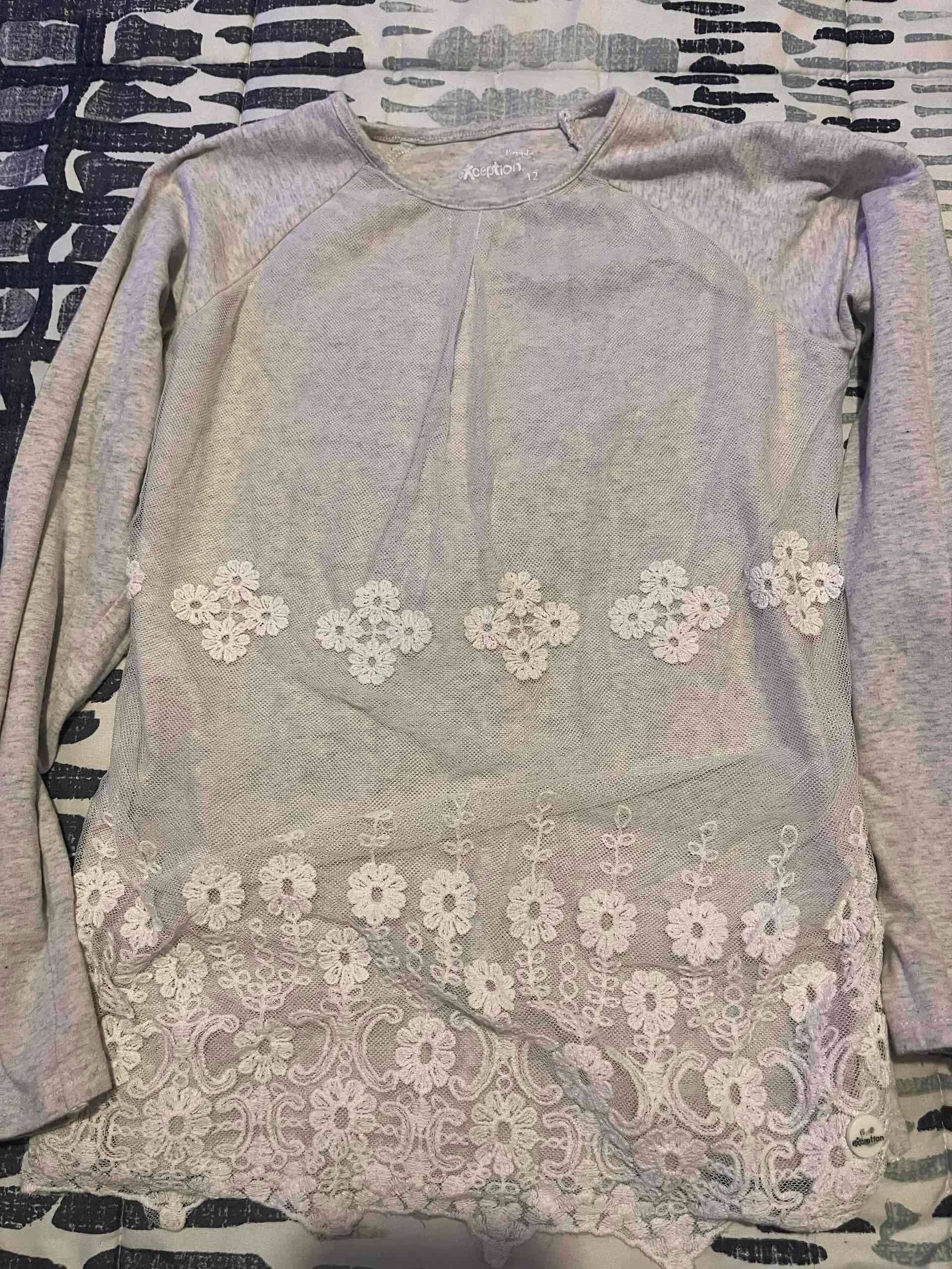 Polera de manga larga en tono gris con detalles de encaje floral. Ideal para un look casual y elegante. Se ve en buen estado.
