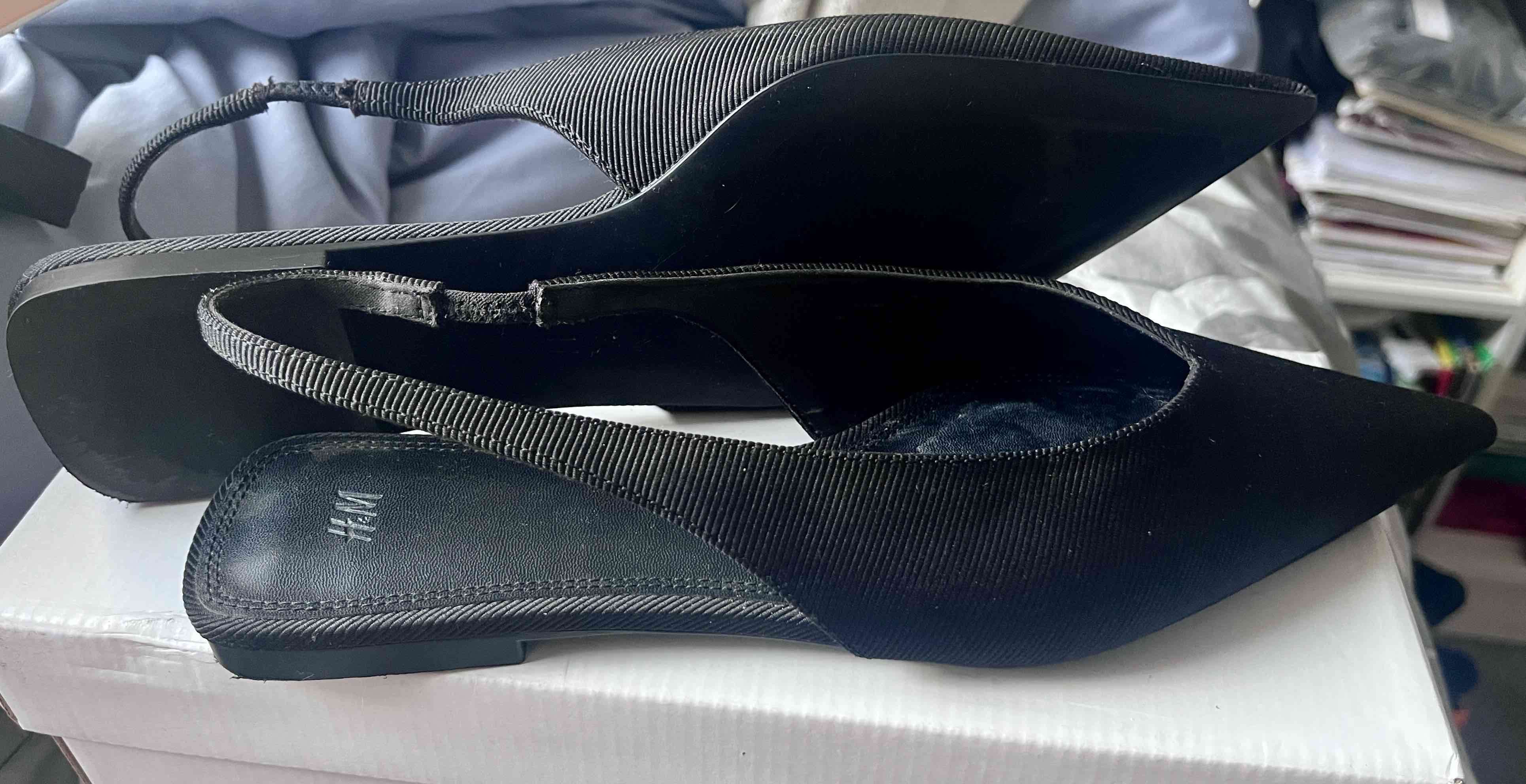 Zapatos planos negros de punta fina, elegantes para ocasiones formales. En buen estado general.