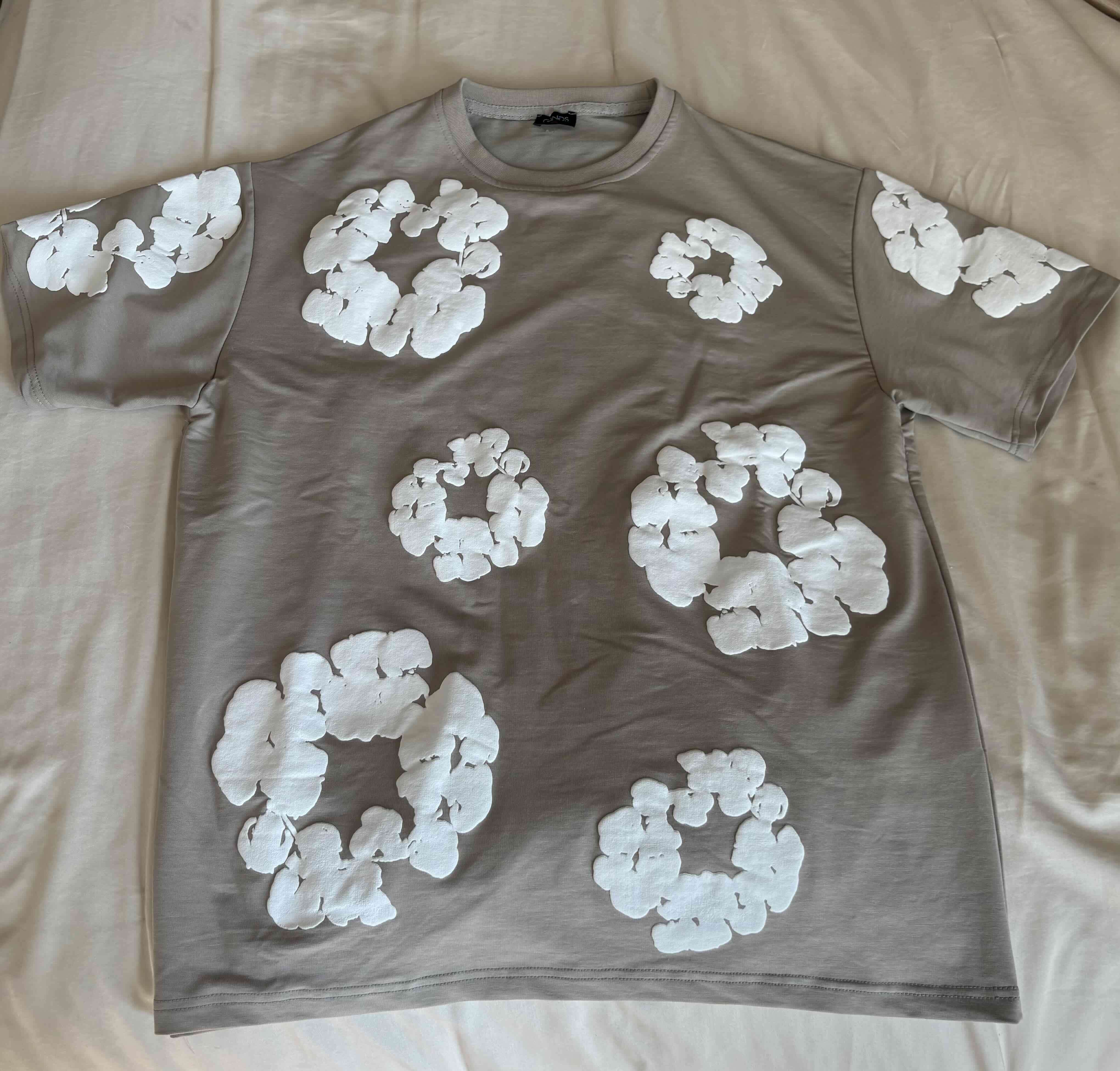 Polera gris de manga corta con estampado floral blanco. Ideal para uso casual. En buen estado general.
