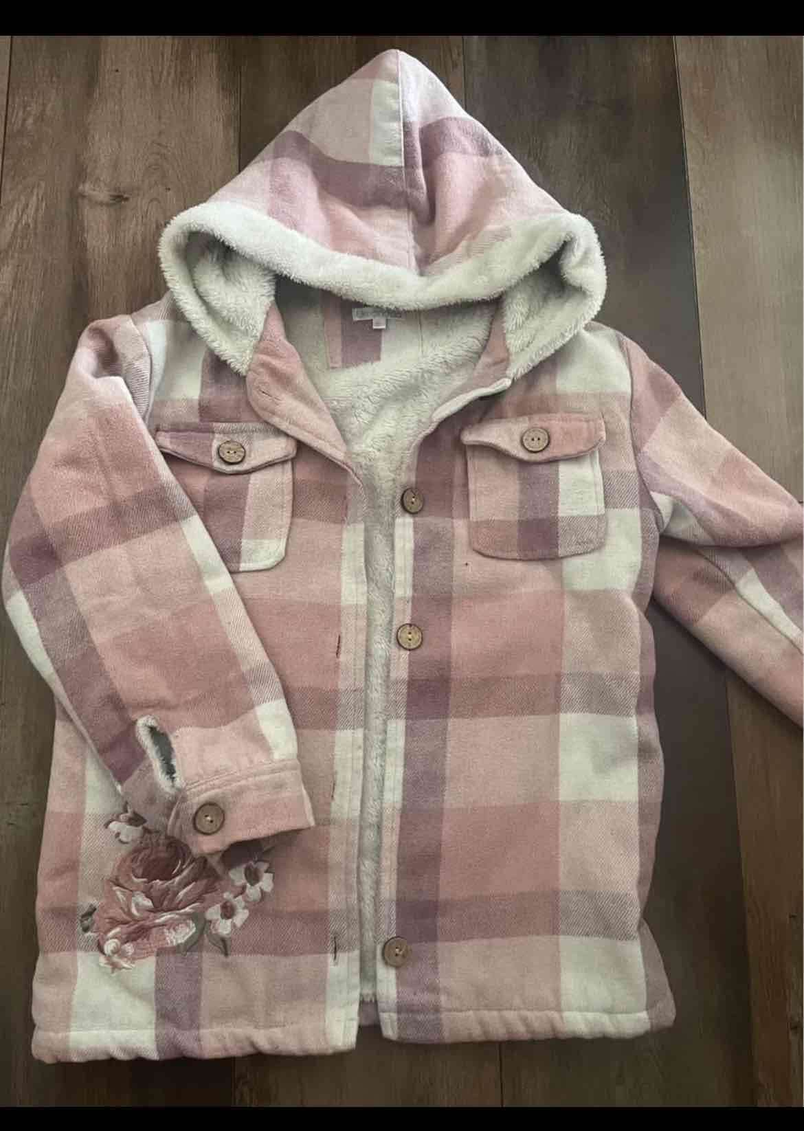 Abrigo infantil con capucha y diseño de cuadros rosados. Interior suave y cálido, ideal para el invierno. En buen estado. Detalle botón