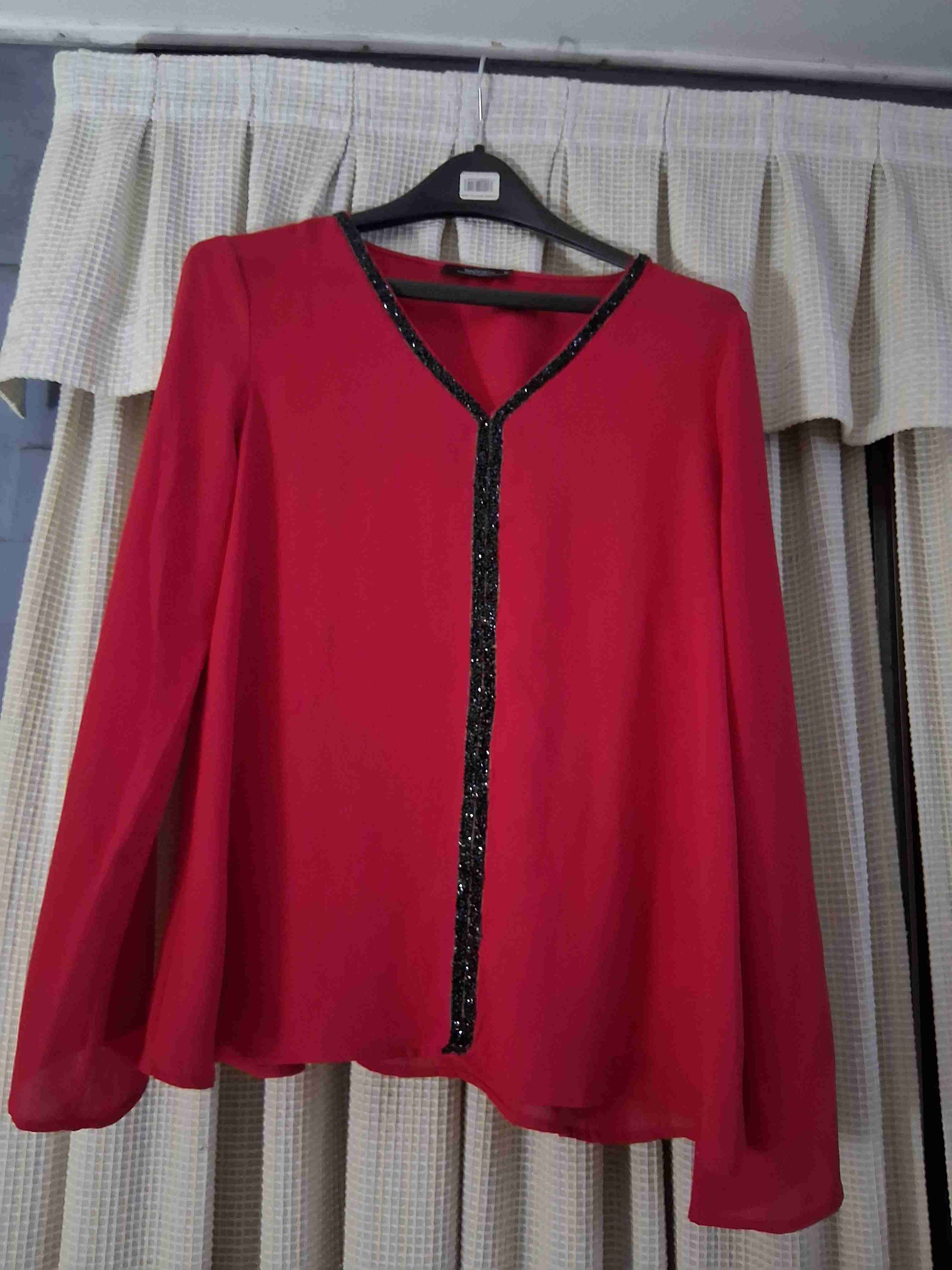 Elegante blusa roja con detalle brillante en el borde frontal. Ideal para ocasiones especiales. Buen estado.
