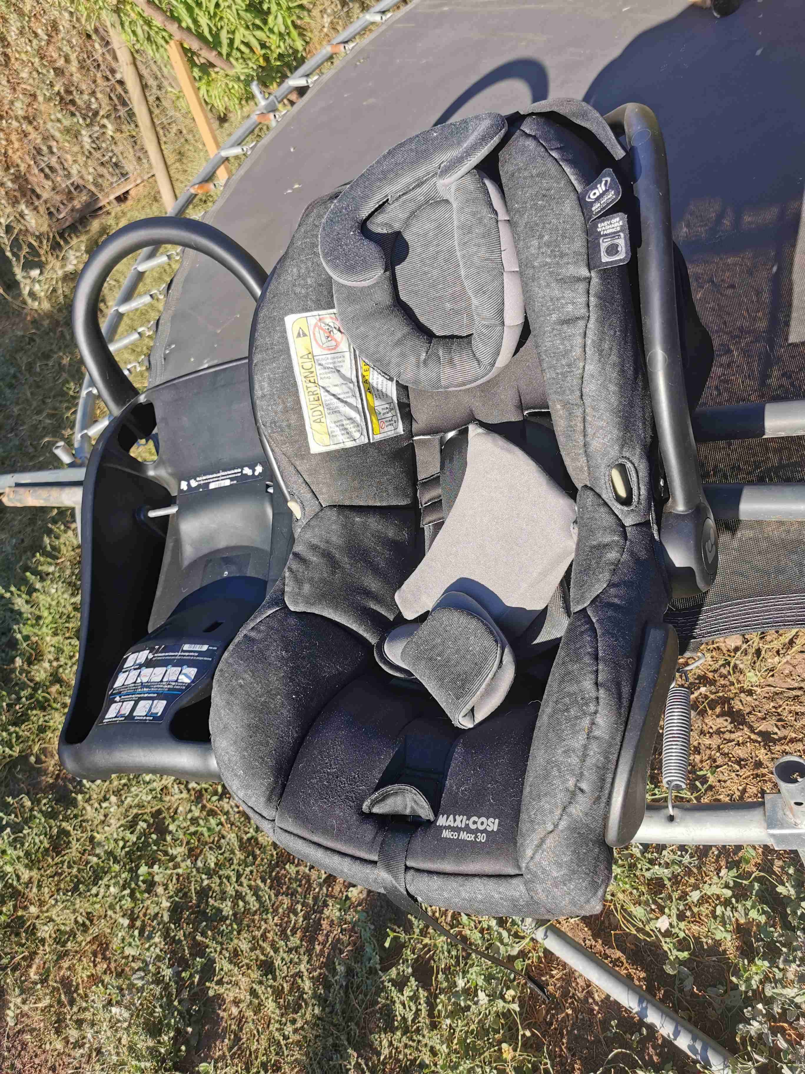 Silla de auto para bebé marca Maxi-Cosi, color negro. En buen estado, ideal para viajes seguros. Huevito y butaca, para bebés recién nacidos hasta 36kg, Llegar y usar.