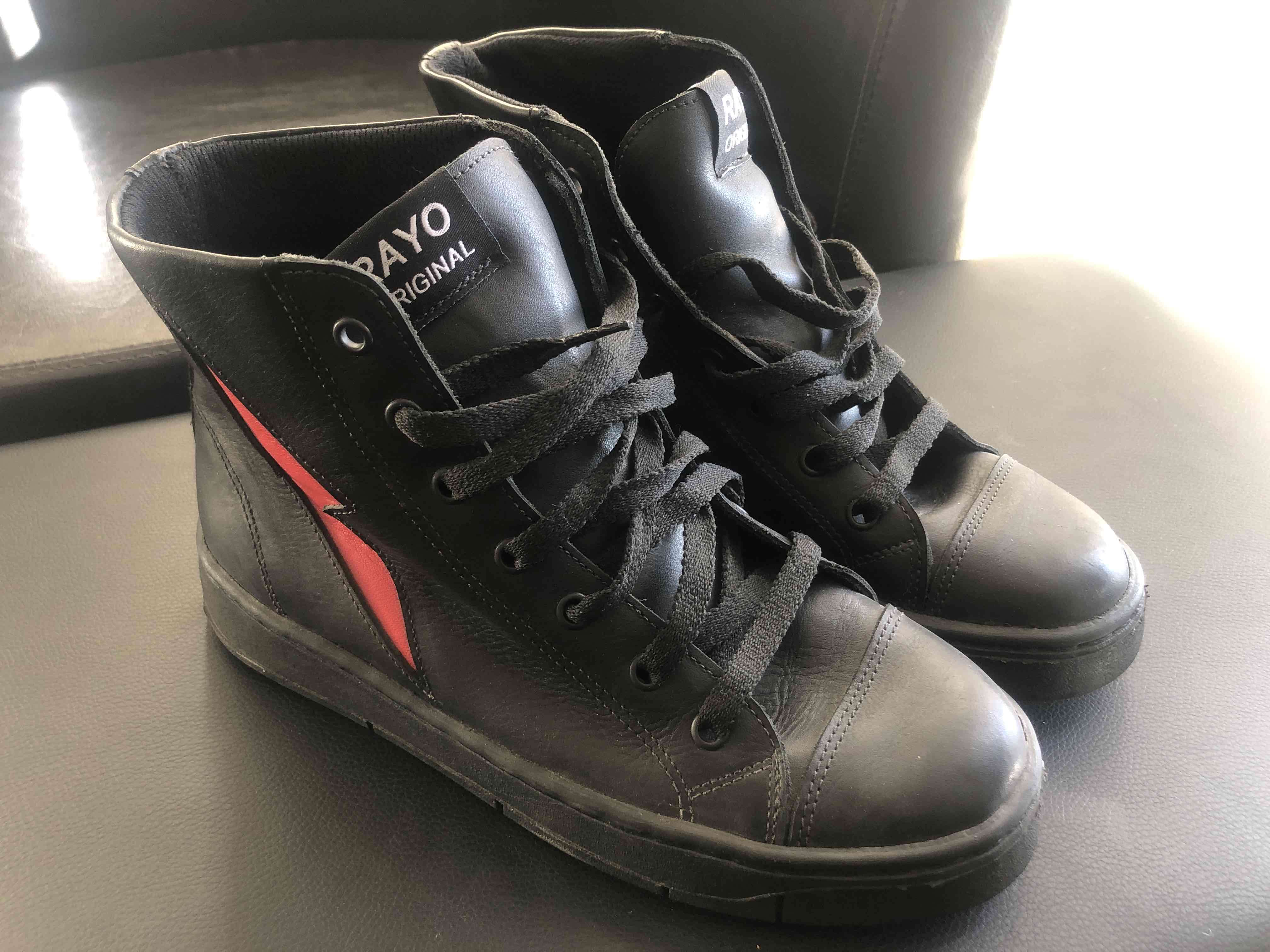 Zapatillas negras de caña alta con diseño moderno y detalle rojo. Las mandé a hacer al fabricante (Rayo) pero me quedaron chicas, así es que están nuevas sin uso.