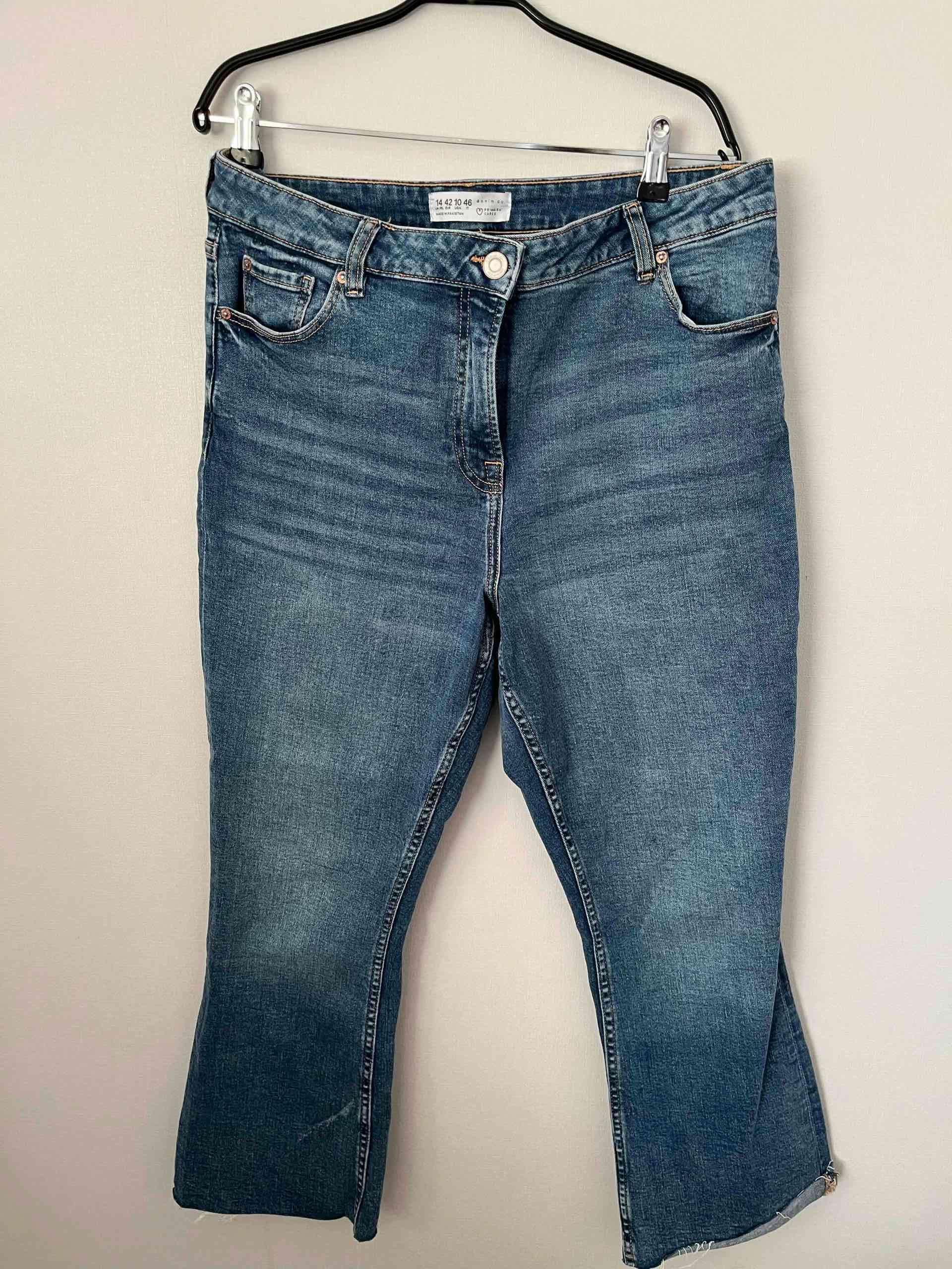 Jeans de corte recto en color azul medio. En buen estado, perfectos para uso diario.